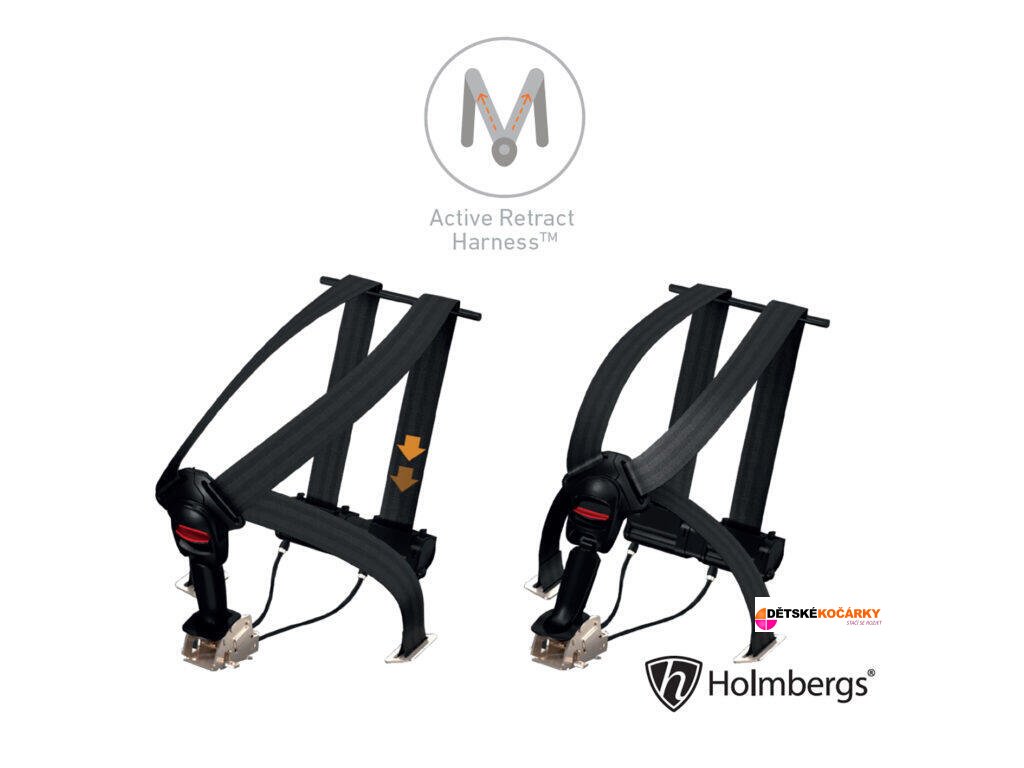 Revoluční systém utahování pásů Active Retract Harness™ pomáhá rodičům s připoutáním jejich dítěte do autosedačky. Funkce automatického dotahování je uvnitř konstrukce sedačky a spouští se pomocí polohování mezi nožní spony. Dítě posadíte do autosedačky, připoutáte jej a zatáhnutím za ramenní popruhy dotažení pásu zajistíte.