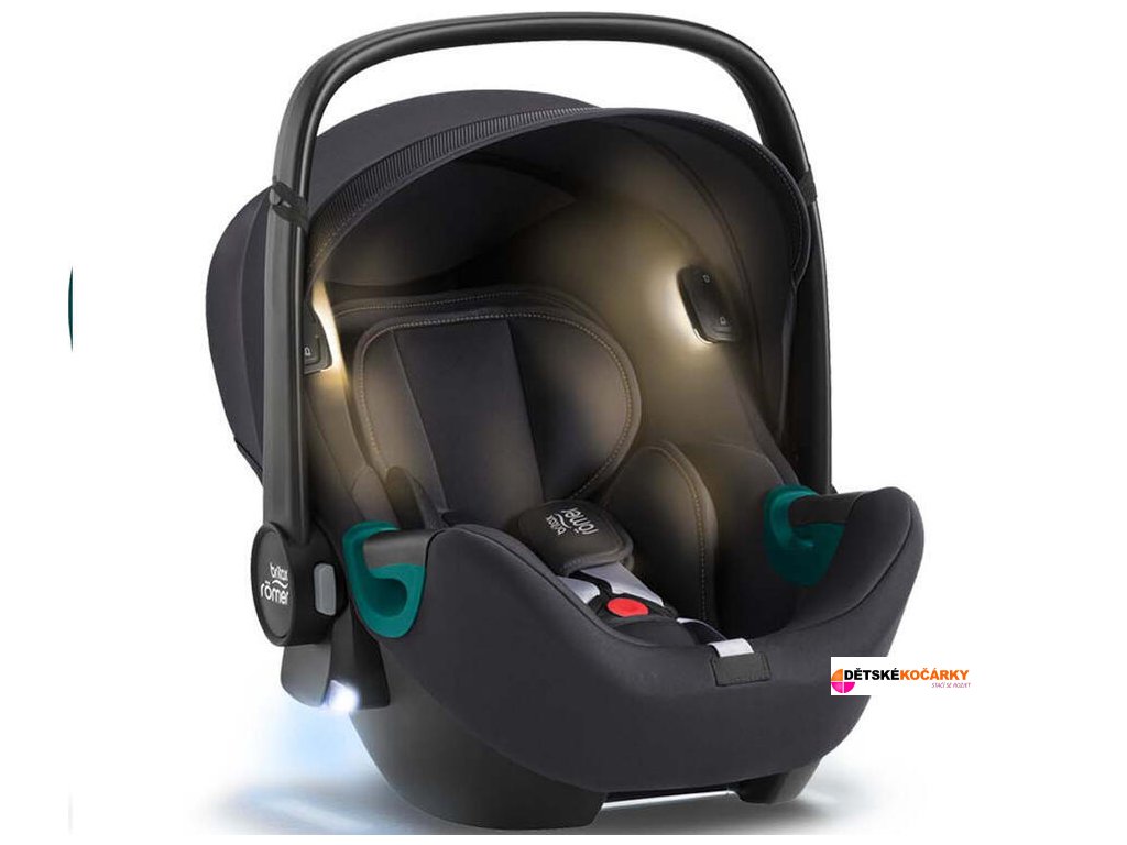 - po vyjmutí sedačky ze základny se spodní dvojice světýlek automaticky rozsvítí a zůstává rozsvícena i po nacvaknutí na podvozek kočárku