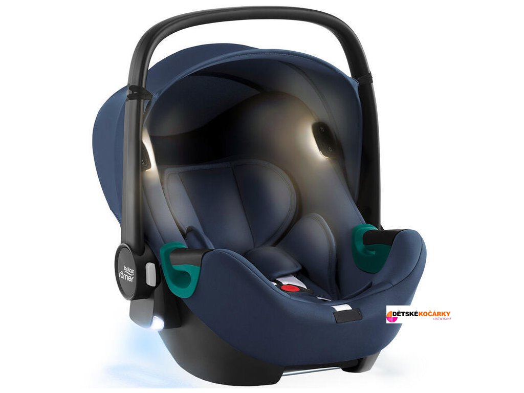 - po vyjmutí sedačky ze základny se spodní dvojice světýlek automaticky rozsvítí a zůstává rozsvícena i po nacvaknutí na podvozek kočárku