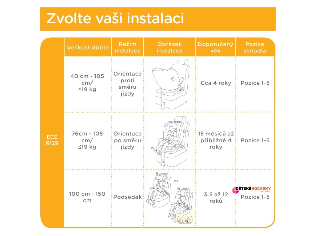 - schválení pro použití po směru jízdy 76-105 cm (max. 19kg), dítě poutáno 5-ti bodovými pásy, min. 15 měsíců, instalace pomocí ISOfixu a opěrné nohy
