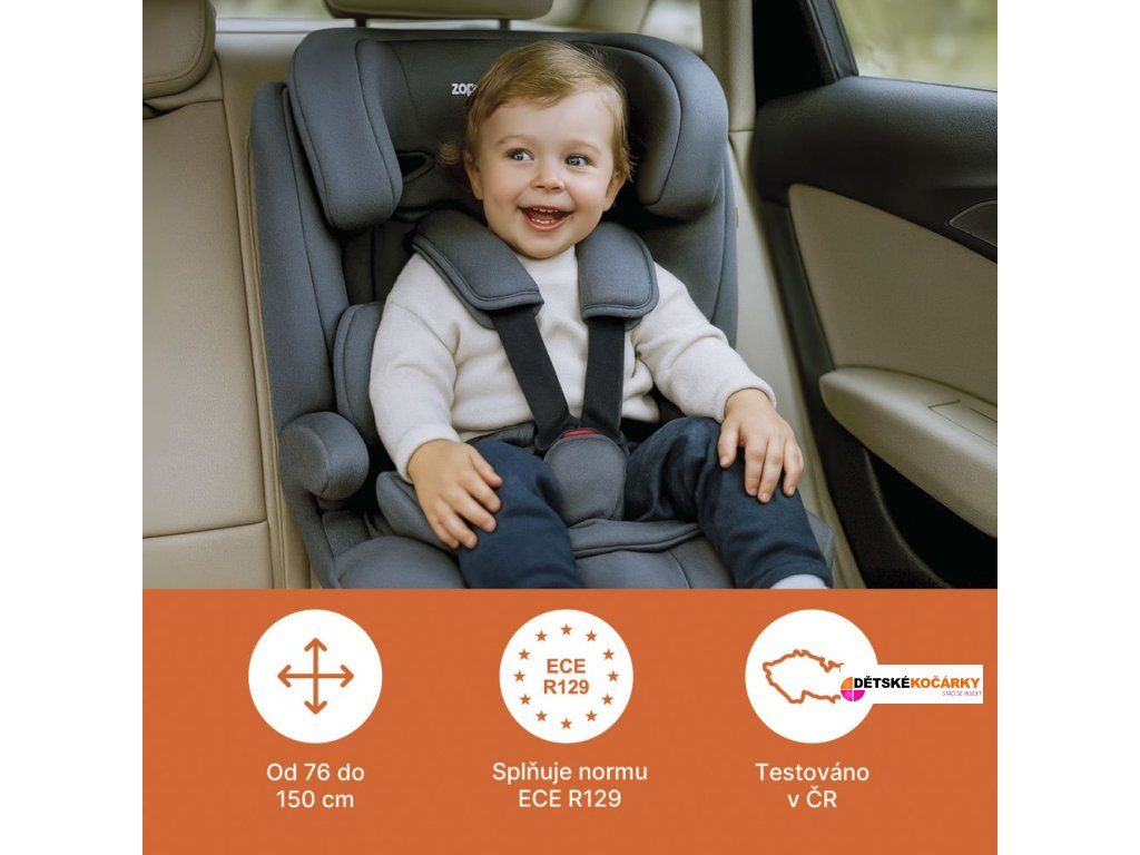 ZOPA Alfa R129 je univerzální autosedačka pro děti od 76 do 150 cm. Splňuje přísnou bezpečnostní normu ECE R129 (i-Size), roste s dítětem a poskytuje spolehlivou ochranu po celou dobu používání. a splňuje . Pro menší děti (od 76 do 105 cm) využívá autosedačka 5-ti bodový bezpečnostní pás a pevné uchycení pomocí Isofixu a Top Tetheru. Pro starší děti (od 100 do 150 cm) se pak používá 3-bodový bezpečnostní pás vozidla. Díky nastavitelné opěrce hlavy a pásům se autosedačka vždy dokonale přizpůsobí aktuální výšce dítěte. Sedačka je vybavena boční ochranou a pohodlným polstrováním, které zvyšuje komfort i na delších cestách. Snadno odnímatelný potah lze prát v pračce, což výrazně usnadňuje údržbu.