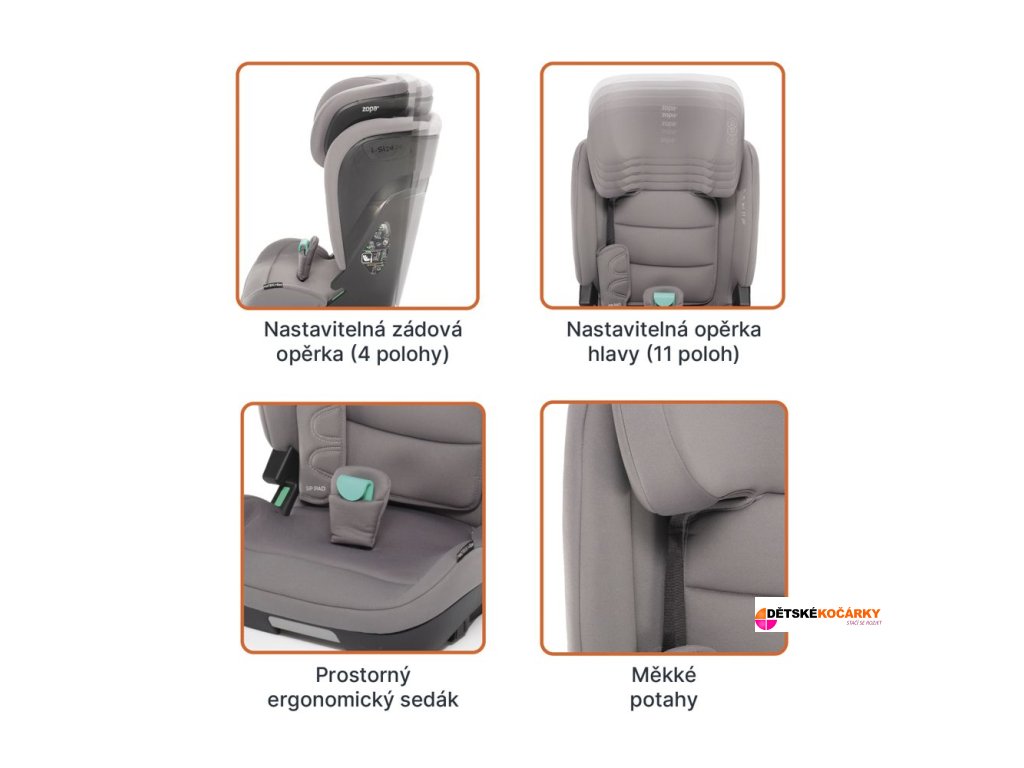 Prostorná autosedačka ZOPA Matrix i-Size s měkkými potahy a možností naklonění do 4 ergonomických poloh zajistí pohodlnou cestu i při delší jízdě a během spánku. Polohování se dá jednoduše nastavit pojistkou ve přední části autosedačky. Opěrka hlavy nabízí až 10 poloh nastavení, díky tomu autosedačka roste s dítětem. Autosedačku lze do vozidla nainstalovat pomocí bezpečnostního pásu, či pomocí ISOFIX kotvícího systému. Inovativní funkce nezávislých ISOFIX umožňuje vysunout každou stranu zvlášť a tím je proces instalace jednodušší. Indikátor správného nastavení a vodiče pásů jsou jistotou, že instalace autosedačky do vozu je správná.