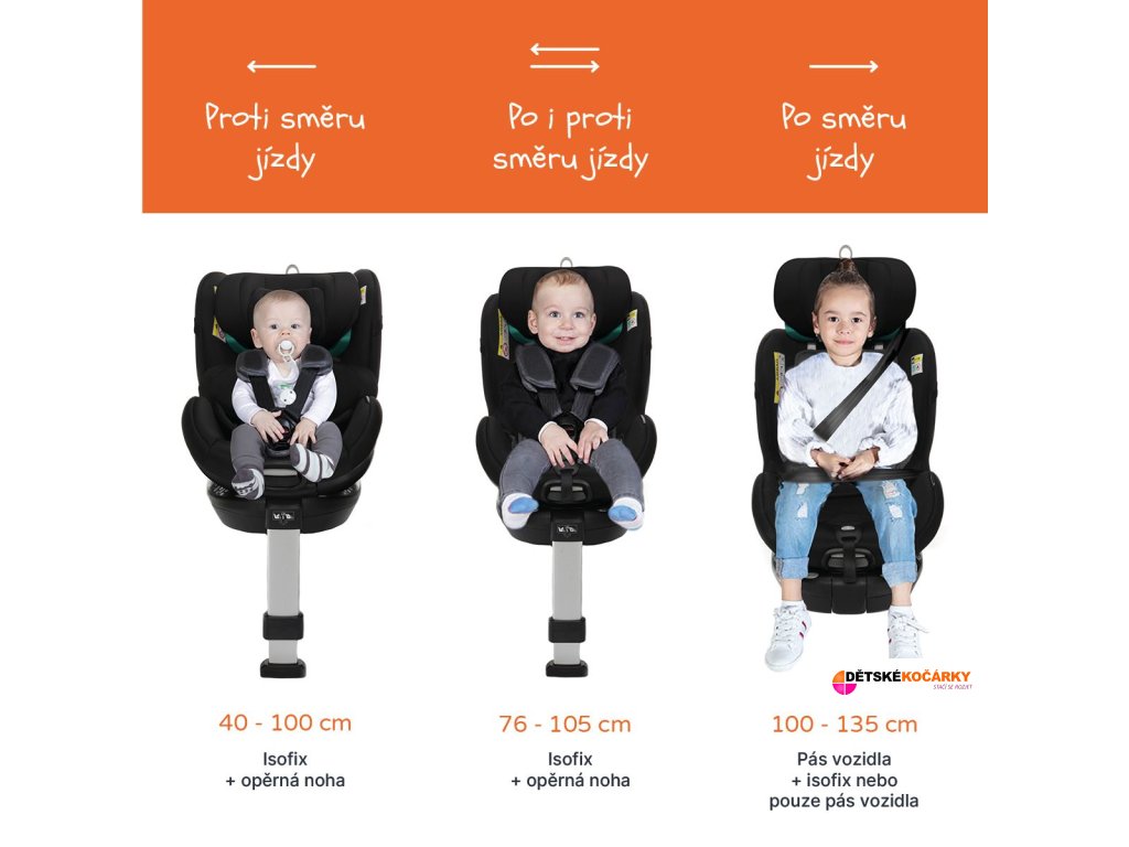 pozice v autě: proti směru směru jízdy (40 - 76cm)/po směru jízdy (76 - 135cm)
