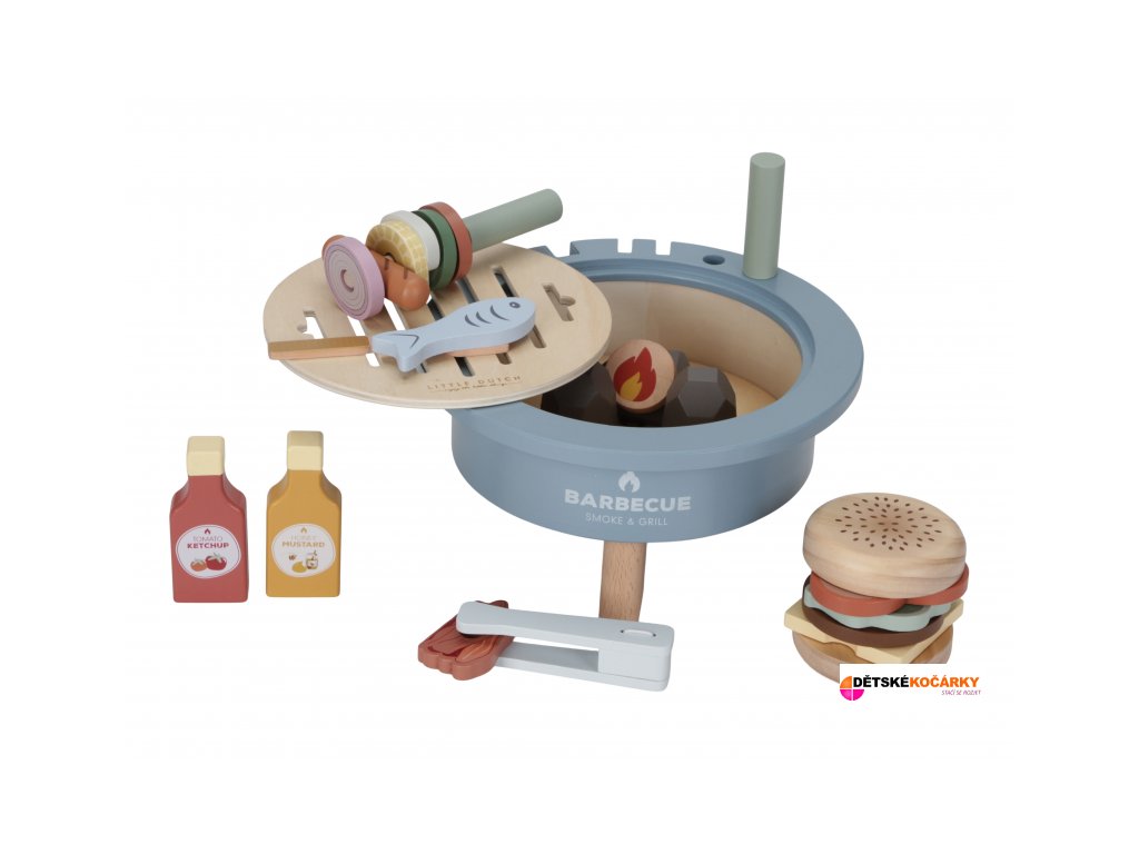S touto bohatě vybavenou sadou na grilování LITTLE DUTCH má váš malý kuchař či kuchařka po ruce vše potřebné k přípravě letní barbecue party. Dali byste si zelenino-masový špíz, hamburger nebo grilovanou rybu? Než si vyberete, na co máte chuť, váš kuchař či kuchařka naplní gril dřevěným uhlím, aby se gril správně nahřál. Tato dřevěná hračka poskytne vašemu dítěti hodiny kreativní hry, ať už griluje pro panenky, plyšáky nebo ostatní členy rodiny.