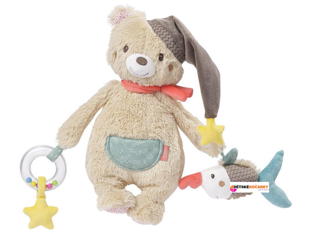 Aktivity hračka medvěd BABY FEHN Bruno je mazlivá plyšová hračka a ochránce v jednom, který se rychle stane dětským kamarádem. Na rukách má vzrušující hračky: prstencový kroužek s barevnými korálky, plyšovou hvězdičkou a plyšovou rybku. Barevné korálky se v jejím potrubí rozlétly. To podporuje motorické dovednosti a připravuje hodně radosti. Neobvyklý tvar a různé materiály ryb poskytují skvělou hmatovou a smyslovou zkušenost. Díky svému tvaru zaručuje Bruno nejlepší zábavu na cestách. Rychle se upevní na kočárky a autosedačky.