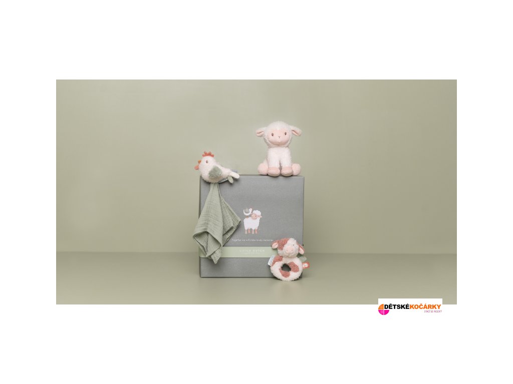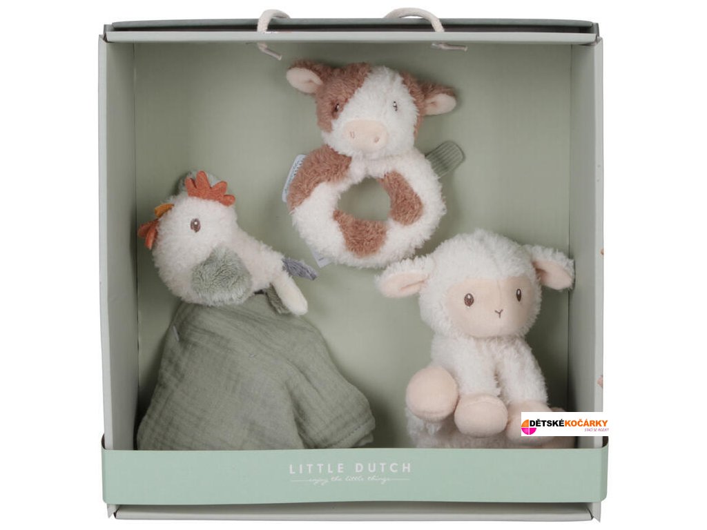 Krásná dárková sada plyšových hraček z designové kolekce LITTLE DUTCH Farma je ideální jako dárek pro novorozené miminko. Sada obsahuje chrastítko v podobě kravičky, muchláčka se slepičkou a plyšovou ovečku.