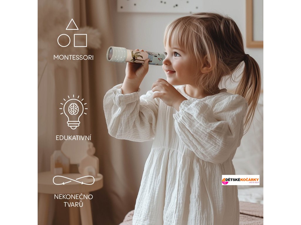 Barevný dětský kaleidoskop ZOPA s ilustracemi přírody a zvířat okouzlí každé zvídavé dítě. Na první pohled zaujme milým designem, ale skutečné kouzlo se odehrává uvnitř – s každým otočením vzniká nekonečno kombinací barev a tvarů. Tato klasická hračka je ideální pomůckou v duchu montessori pedagogiky, která stimuluje smysly, podporuje tvořivost a má výrazný edukativní přínos. Díky svému jednoduchému principu a pasivnímu ovládání je ideální i pro děti v rámci montessori aktivit, které vedou k samostatnému poznávání a pozorování.
