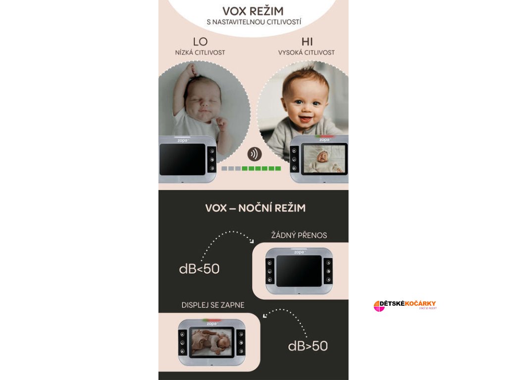 Chůvička ZOPA Static je plná chytrých vychytávek pro každou situaci. Kdykoliv můžete své děťátko uklidnit na dálku vlastním hlasem nebo pustit uklidňující melodie pro příjemné usínání. Integrovaný teploměr vám pomůže vytvořit ideální podmínky pro spánek – nejen že zobrazuje aktuální teplotu v místnosti, ale také vás upozorní, pokud by byla příliš vysoká. Pro klidné noci oceníte úsporný noční režim, který automaticky vypne přenos zvuku i obrazu, když je v pokoji ticho. Při jakémkoliv zvuku se okamžitě znovu aktivuje.