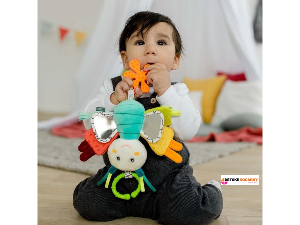 Dětská motorická hračka DoBabyDoo BABY FEHN Aktivity motýl je ideální do kočárku, postýlky nebo autosedačky a je vhodná pro děti od 3 měsíců. Natahovací hračka, která vibruje a vydává zvuky zvířátek obsahuje barevné uchopovací prvky, které podporují smysl pro zrak, hmat, uchopení a sluch, zatímco měkké kousátko ve tvaru hvězdy pomáhá s prořezáváním zoubků. Miminka budou trénovat své sebevědomí pomocí bezpečného zrcátka a legrační zvuky, které vydává chrastítko je budou fascinovat a zabaví je na dlouhou dobu. Hračku lze pomocí praktického C-kroužku připevnit na kočárek, dětskou autosedačku nebo postýlku.