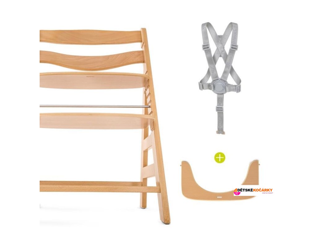 Set obsahuje: dřevěnou jídelní židličku + 5-ti bodový bezpečnostní pás + ochranný oblouk + bezpečnostní mezi-nožní popruh