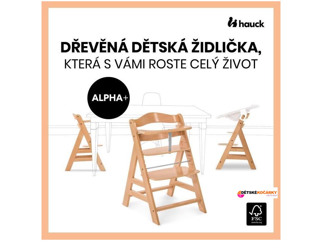 Dětská jídelní židlička HAUCK Alpha+ je vyrobená z kvalitního bukového dřeva s certifikací FSC®, která roste společně s dítětem. Díky stabilní konstrukci a integrovaným podlahovým kluzákům je židlička Alpha+ odolná proto převrhnutí. Jednoduchý a čistý design se hodí prakticky do každého interiéru. Rostoucí ergonomická židlička poskytuje pohodlí při sezení pro děti i dospělé. Bezpečnostní pás i pětibodové bezpečnostní pásy jsou součástí balení a pomáhají zajistit bezpečnost vašeho dítěte. Jsou také kompatibilní s dalším příslušenstvím HAUCK. Ochranný oblouk je nezbytný pro menší děti, později jej lze odejmout, aby mohlo dítě pohodlně sedět u jídelního nebo psacího stolu.Židlička je velice odolná a skladná a to díky odolné a stabilní kostrukci, kteoru lze snadno sklopit. Ve složeném stavu tak zabírá velice málo místa.