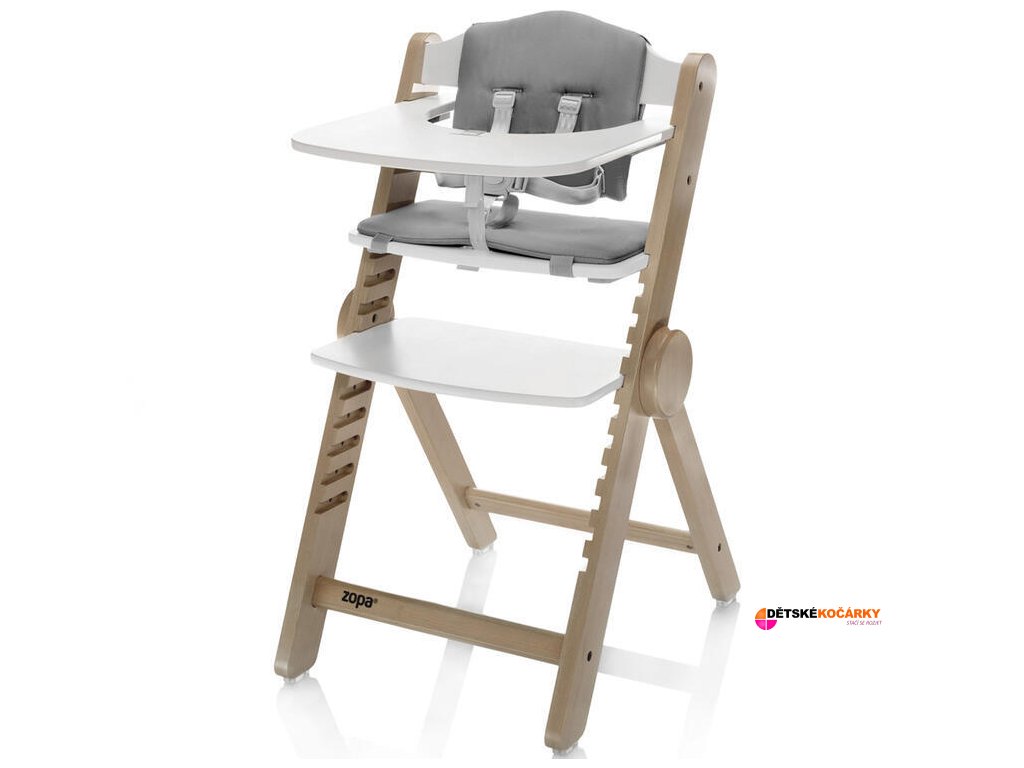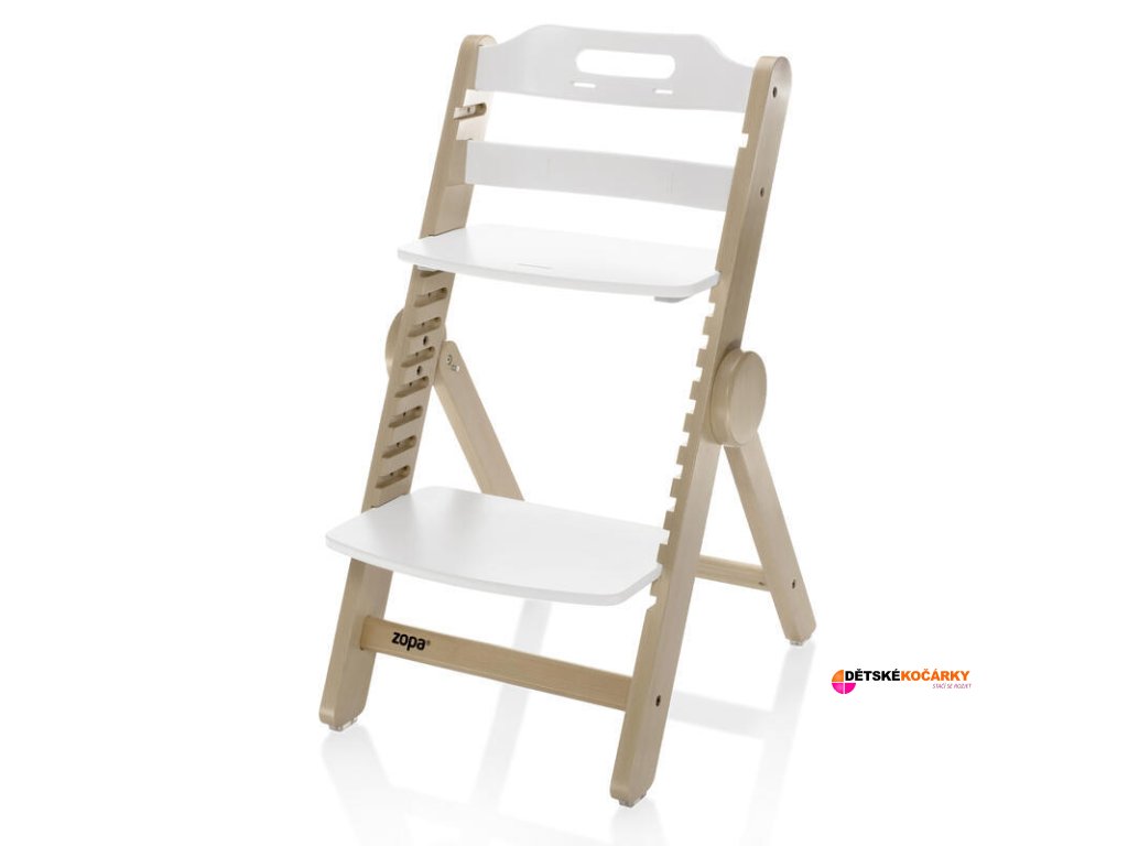 Dřevěná jídelní židlička ZOPA Clipp & Clapp je rostoucí dětská židlička z bukového dřeva s výškově nastavitelným sedátkem a podnožkou, která je skládací a nastavitelná bez nářadí. Židlička nabízí možnost výškově nastavit sedátko a podnožku a tím se dokonale přizpůsobí malému batoleti, které ochutnává svůj první příkrm, školákovi na cestě za poznáním při vypracovávání domácích úkolů, ale i dědečkovi, který mu s nimi pomáhá. Tato židlička je vyrobená z masivního bukového dřeva, nabízí výjimečnou odolnost a nosnost testovanou až na 110 kg, takže spolehlivě unese i dospělou osobu.