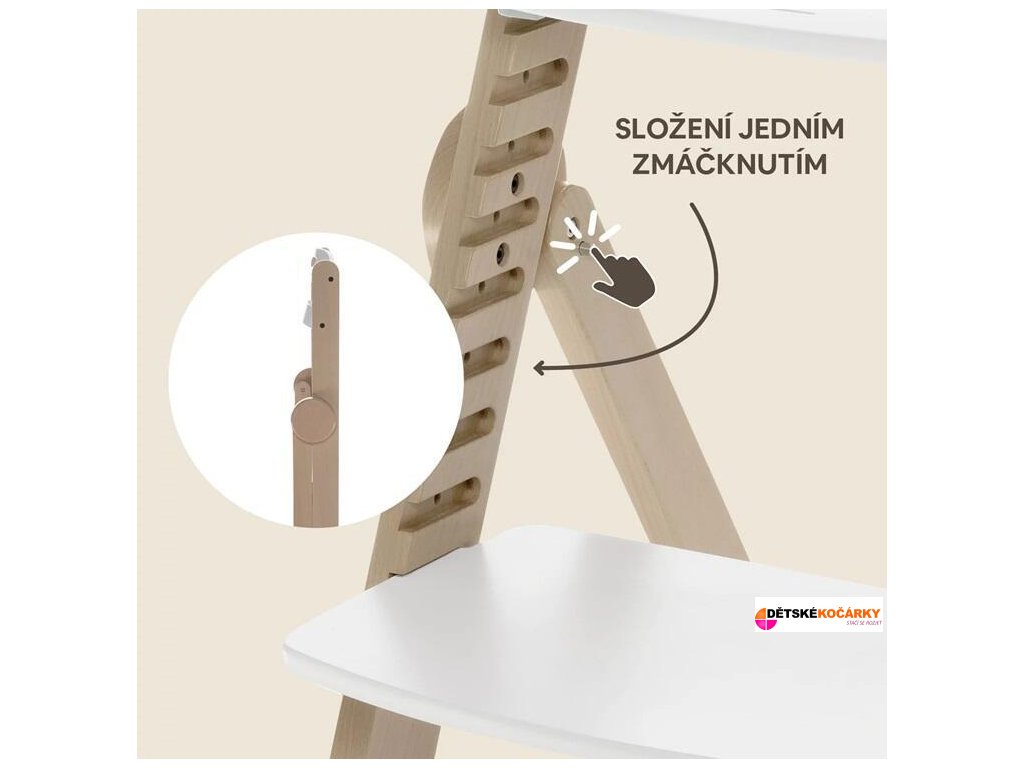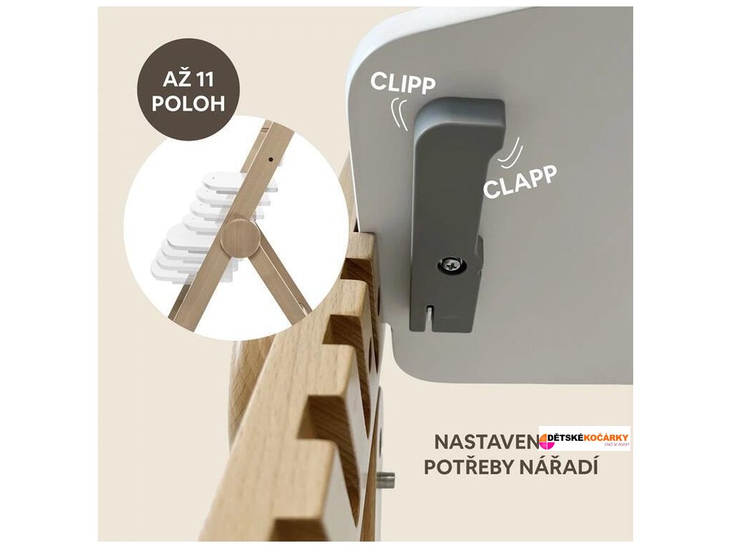 Díky inovativnímu systému Clipp & Clapp lze židličku jednoduše přizpůsobit výšce bez potřeby nářadí. Jako jedna z mála dřevěných židliček na trhu lze složit, což díky kompaktním rozměrům po složení umožní snadné skladování a madlo zase usnadní přenášení židličky. Měkké polstrování, bezpečnostní pás a protiskluzové nohy zajišťují maximální komfort a bezpečí během jídla. Navíc, netoxické a bezpečné barvy zdůrazňují závazek k ochraně zdraví vašich nejmenších.