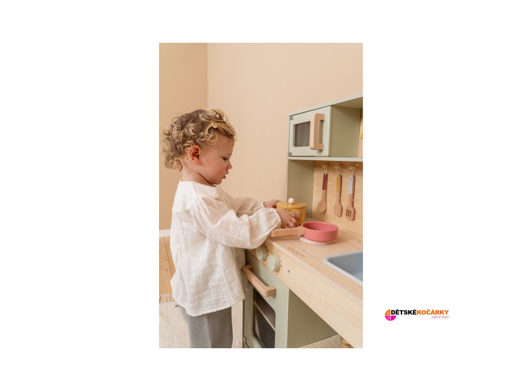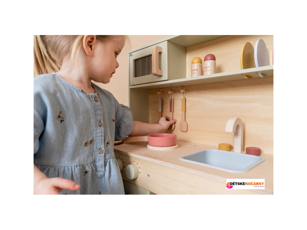 Krásná dřevěná kuchyňka LITTLE DUTCH nabízí vše, o čem malý kuchař či kuchařka sní, když vymýšlí nové recepty pro rodinu či své panenky a oblíbené plyšáky. S pánví, hrncem a dalším nádobím není problém připravit několik chodů najednou. Trouba upeče koláč, na sporáku se uvaří zelenina, mikrovlnka rychle ohřeje, co je potřeba. K dispozici je i sůl a pepř na dochucení. Po práci si kuchař umyje ruce v dřezu. Skříňka nabízí prostor pro uložení potravin. Děti se učí napodobováním svých rodičů a zároveň taková hra rozvíjí kreativitu, soustředění, jemnou motoriku a sociální dovednosti.