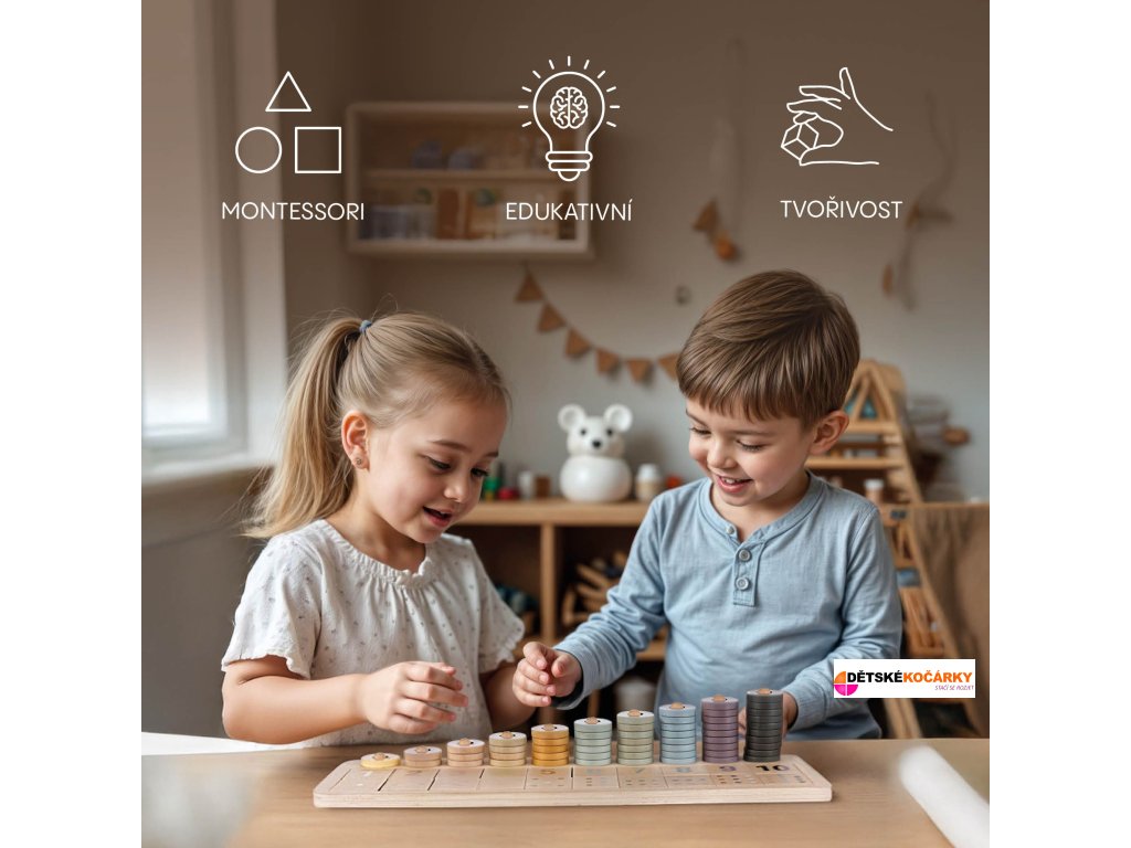 Objevte svět čísel hravou a přirozenou cestou! Dřevěná Montessori hra ZOPA Počítání je ideální pomůcka pro malé objevitele, kteří se právě začínají seznamovat s čísly, barvami a základní matematikou. Vychází z principů Montessori pedagogiky a podporuje logické myšlení, jemnou motoriku a koordinaci oko–ruka.