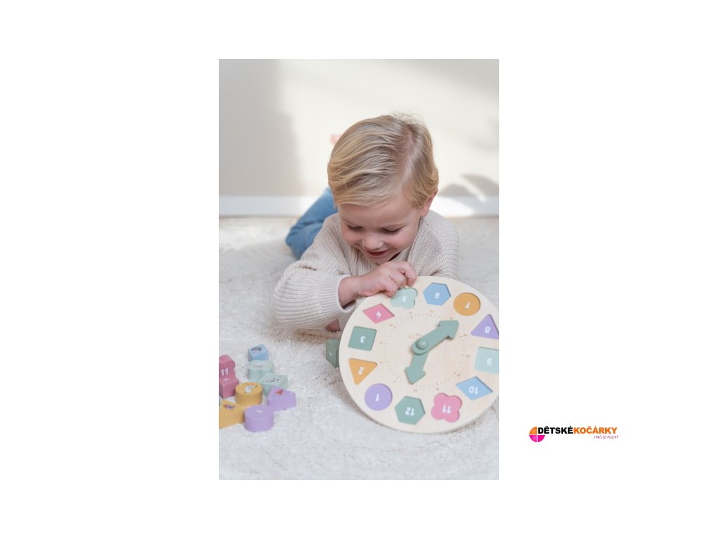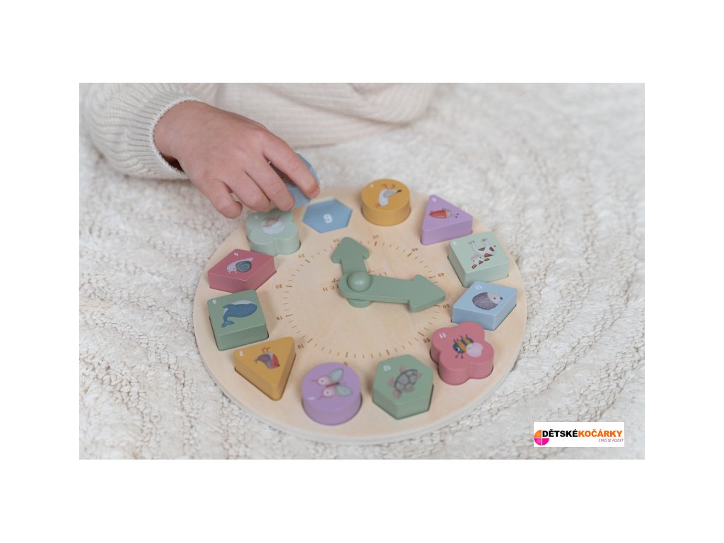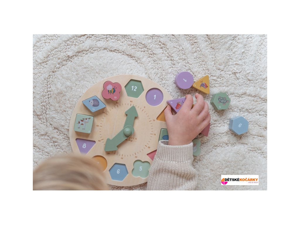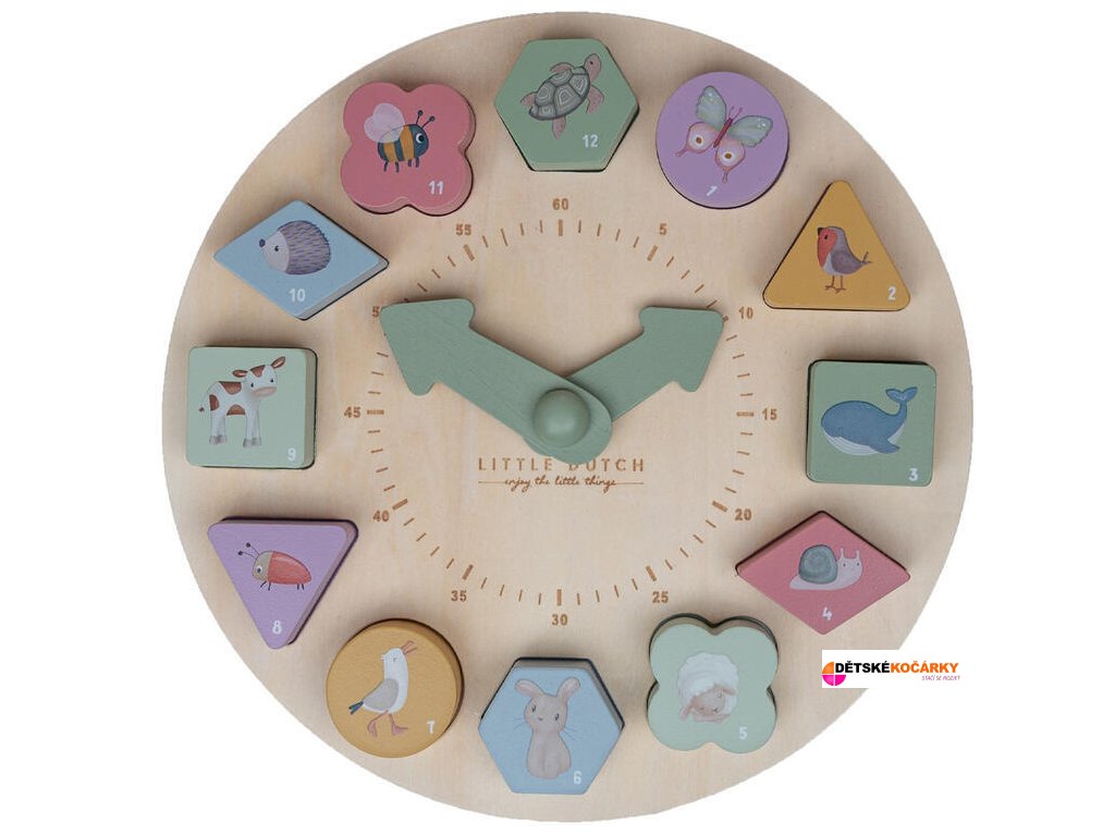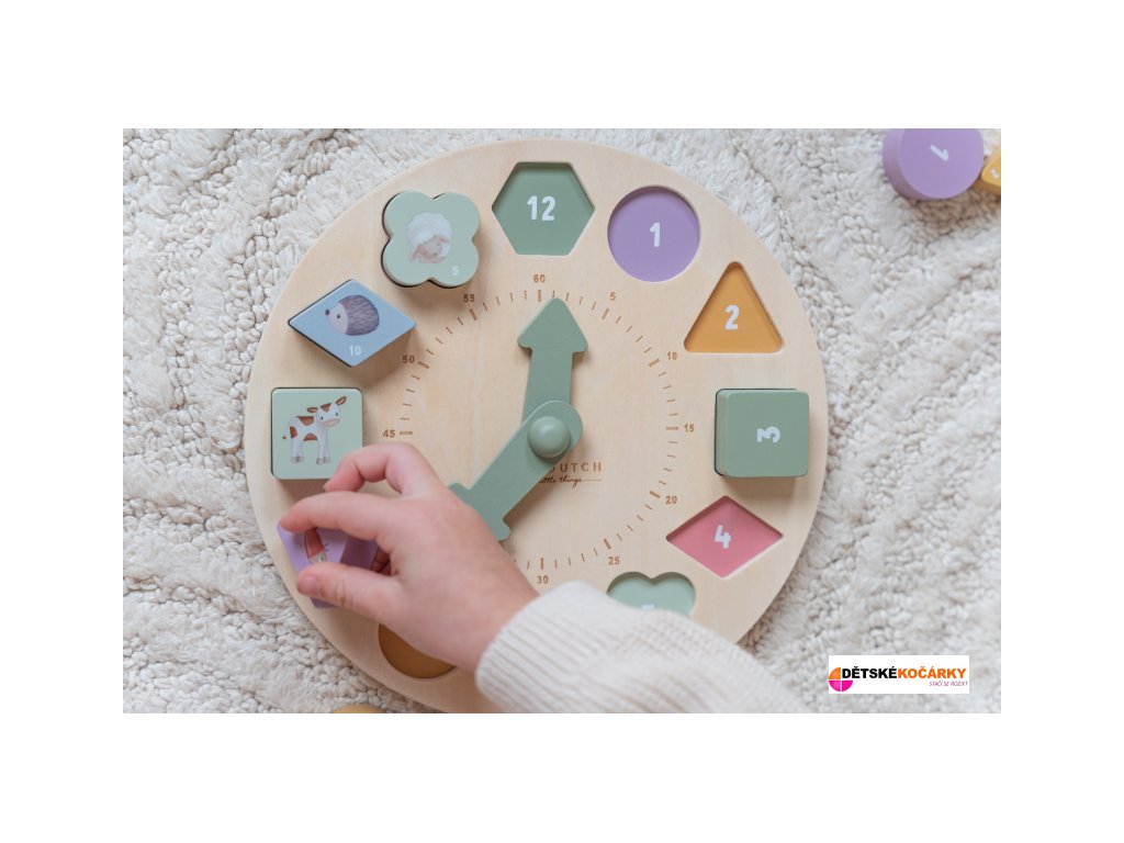 Originální dřevěné puzzle LITTLE DUTCH v podobě ručičkových hodin naučí vaše dítě hravou formou poznávat čas. Hodiny mají pohyblivé ručičky a obsahují 12 kostek různých tvarů a barev s čísly, které pasují do odpovídajících otvorů na ciferníku. Pro zábavnější učení je na každé kostce obrázek zvířátka. Hodiny jsou součástí designové kolekce hraček a doplňků Little Dutch Farma.
