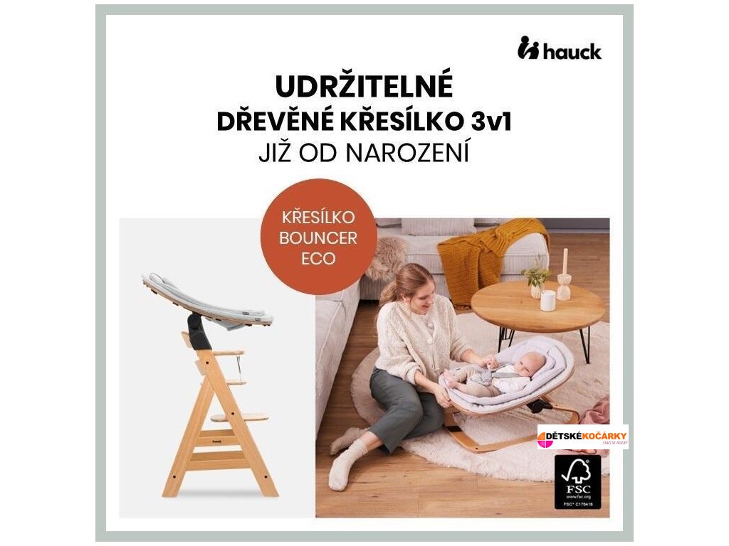 Udržitelné dřevěné křesílko HAUCK Bouncer Eco slouží jako houpací lehátko nebo novorozenecké sedátko pro děti od prvního dne jejich života. Později slouží jako křesílko pro děti do 15 kg. Je pro vás udržitelnost důležitá? Proto se rám křesílka vyrábí z certifikovaného evropského bukového dřeva. Certifikace materiálu FSC® zaručuje udržitelné využívání lesů a ochranu zvířat a rostlin.