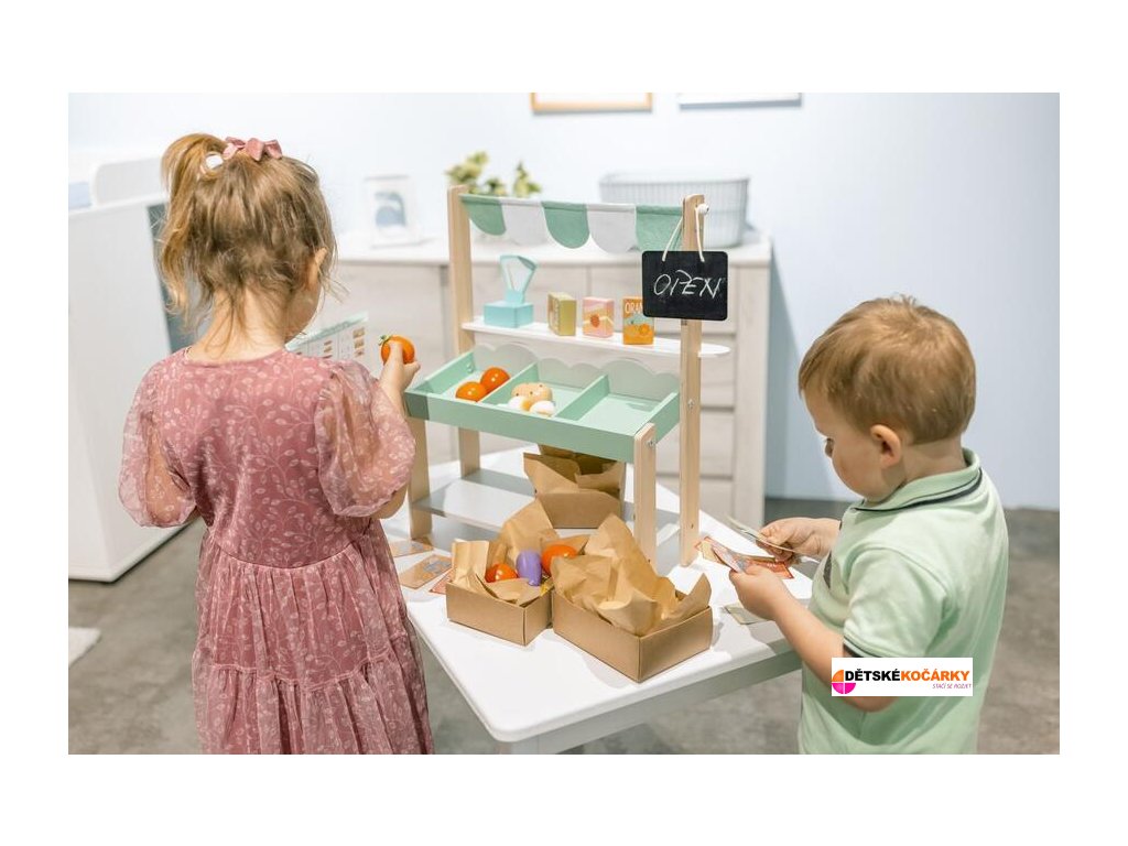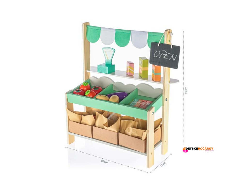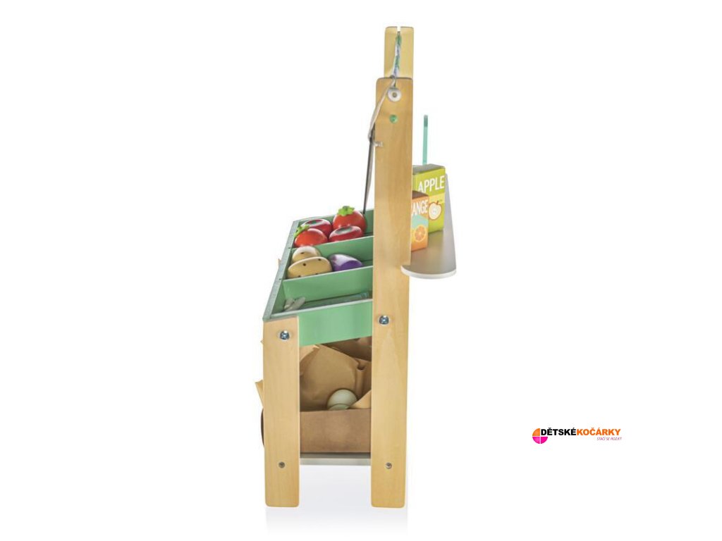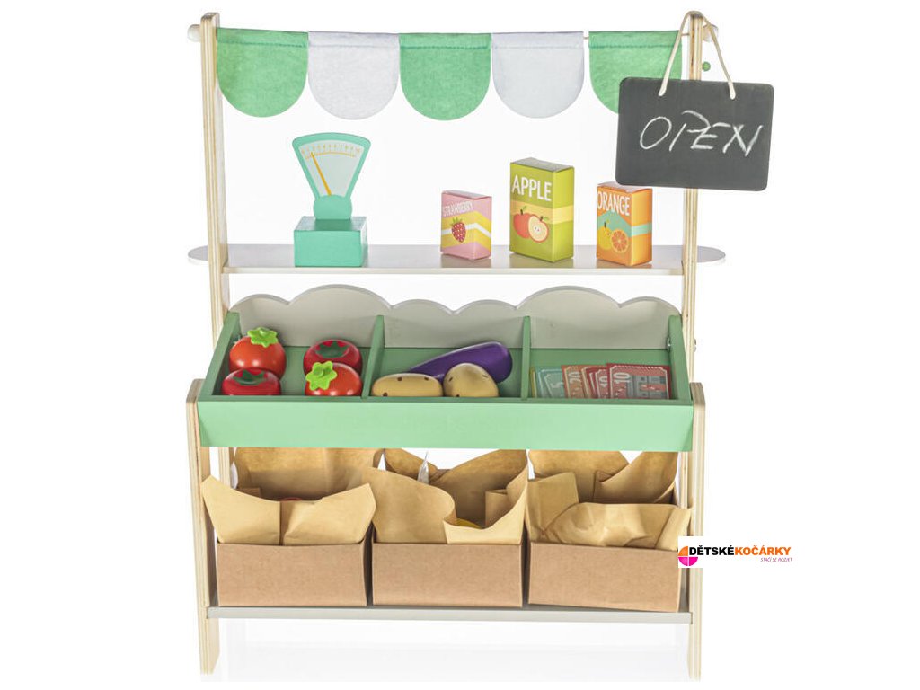 Stánek je vybaven tabulkou, na kterou si děti mohou křídou napsat ceny a denní nabídku, či si sami určit, zda je stánek otevřený nebo zavřený. Fantazii se meze nekladou, a děti zažijí při obchodování spoustu dobrodružství. Součástí stánku jsou tři dřevěné bedýnky, které vypadají jako ty skutečné ze zelinářství, a několik kousků ovoce a zeleniny ze dřeva.