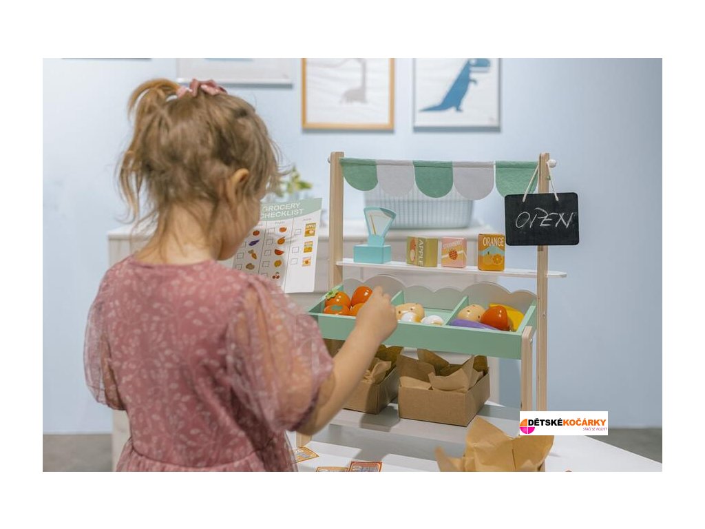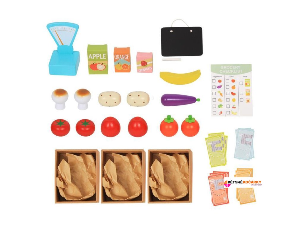 Set obsahuje: dřevěný stánek + látková markýza + 3 bedýnky + dřevěné ovoce a zelenina + tabulku + váhu + nákupní seznam + dětské peníze