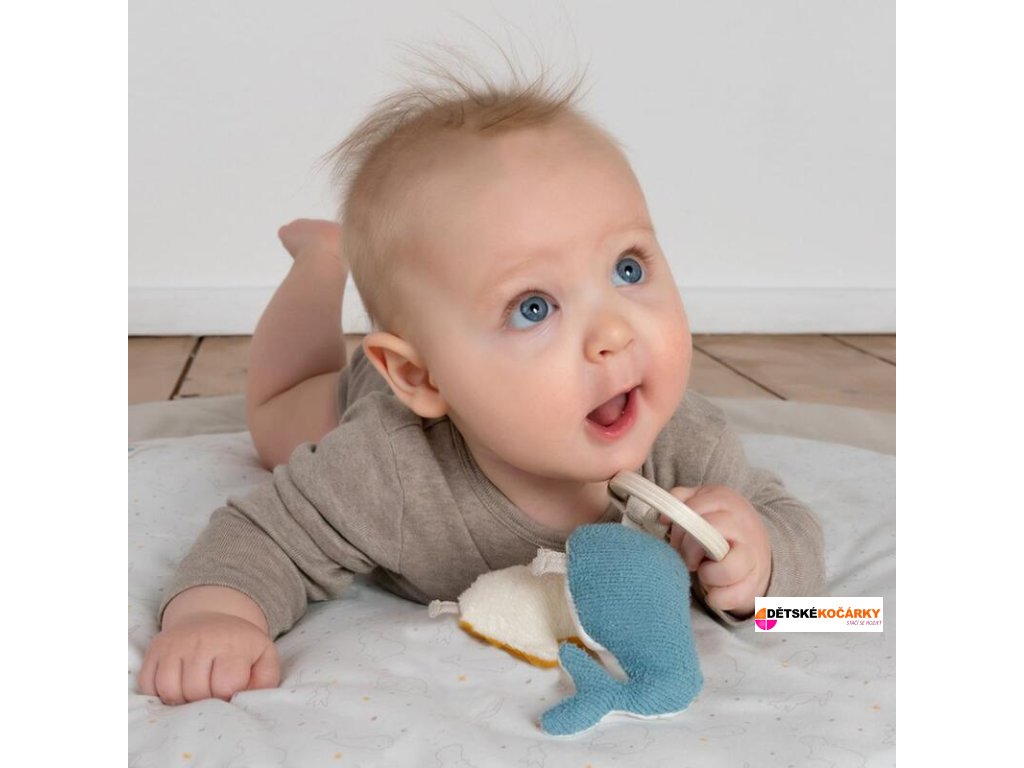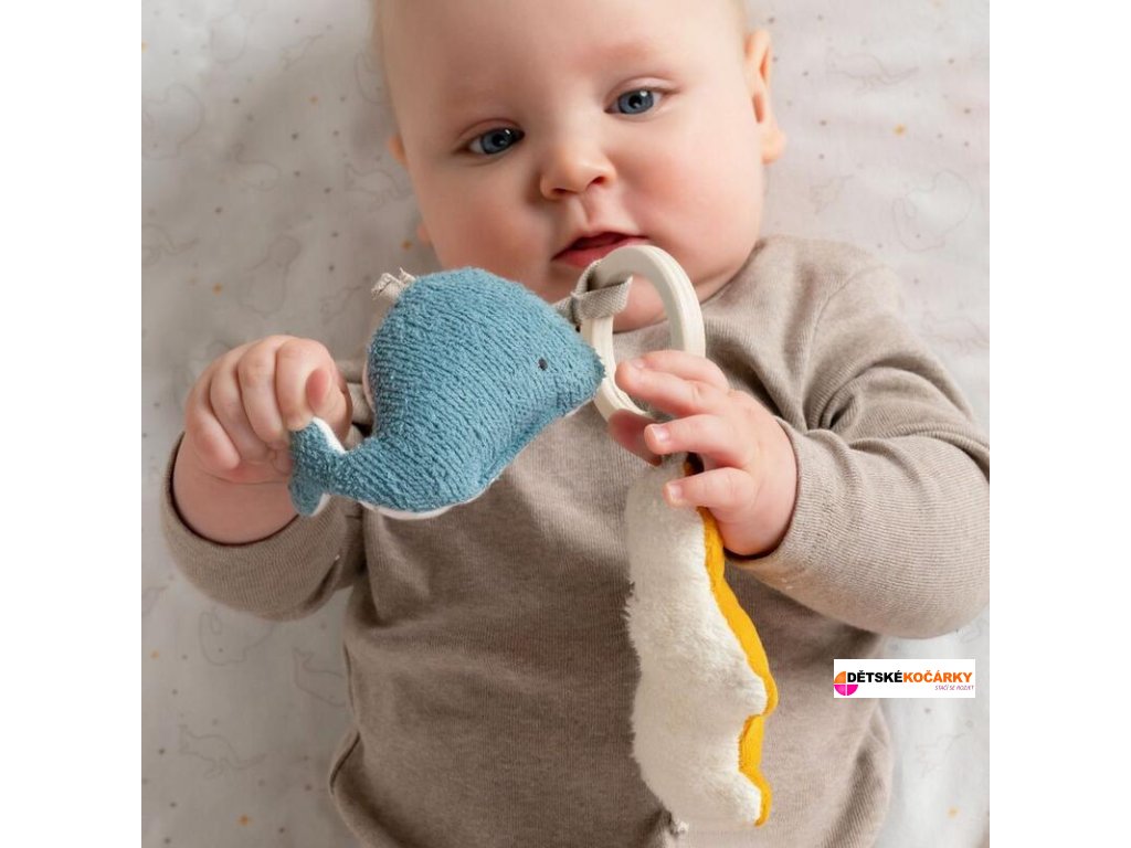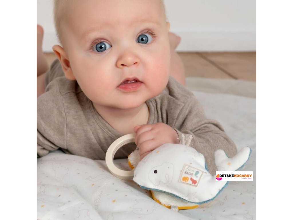 - hračky s chrastítkem a šustícím papírem podporují pocit uchopení, sluchu a motoriky dítěte