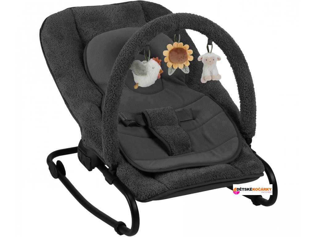 Houpací lehátko LITTLE DUTCH s hrazdou poskytne vašemu dítě pohodlné místo k odpočinku i hraní. Pozornost dítěte upoutají tři zavěšené plyšové hračky v podobě slepičky, kytičky a ovečky.