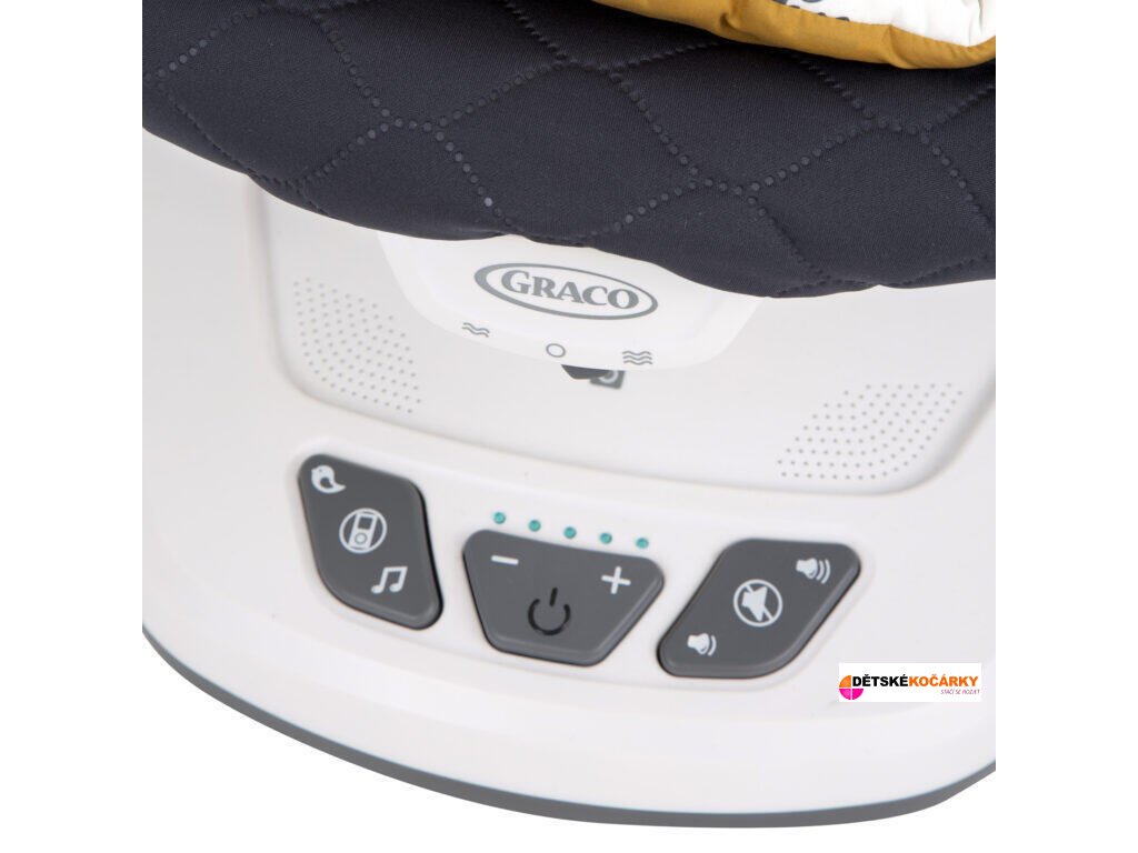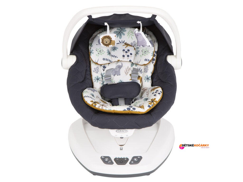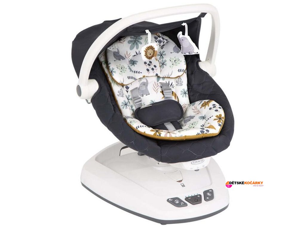 Houpátko s vyjímatelnou vnitřní vložkou GRACO Move With Me nabízí skutečně velké množství možností, jak zabavit malé dítě. Houpátko umožňuje nastavit jednu z pěti rychlostí houpání, 10 druhů hudby, 5 druhů zvuků a navíc je zde možnost přehrávání MP3. Houpátko je možné napájet ze zásuvky nebo pomocí baterií (nejsou součástí balení).