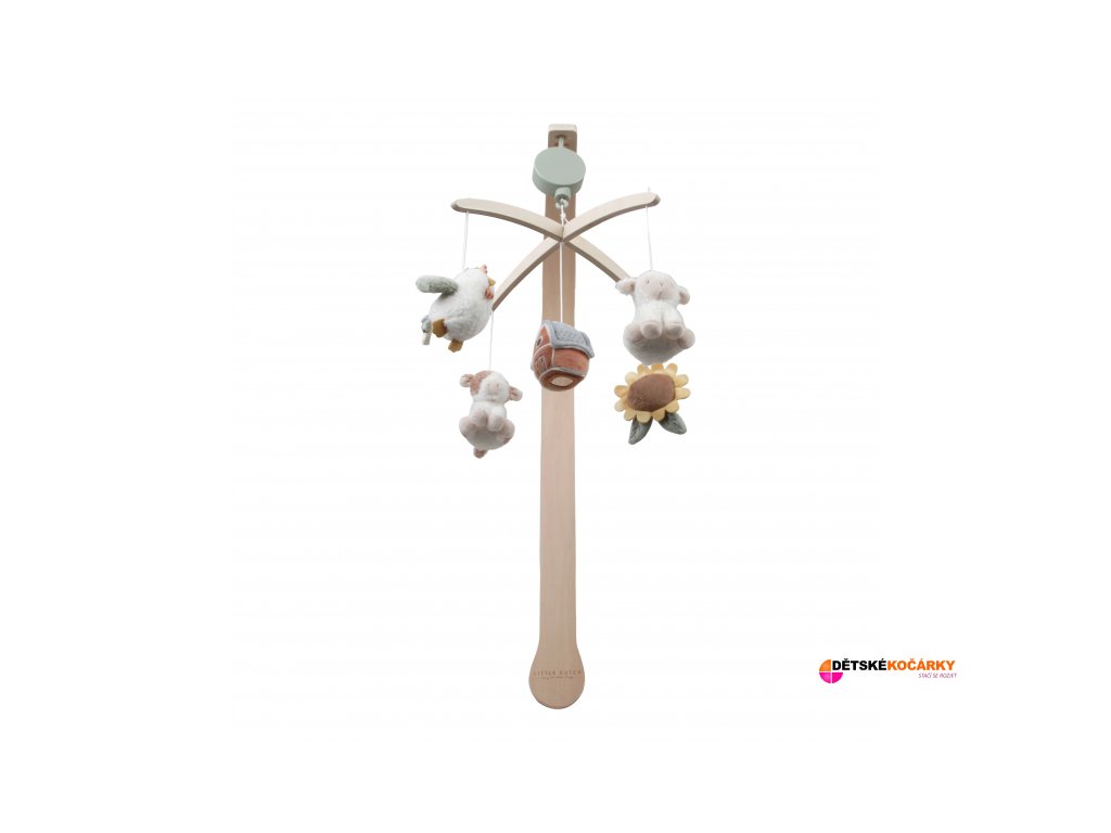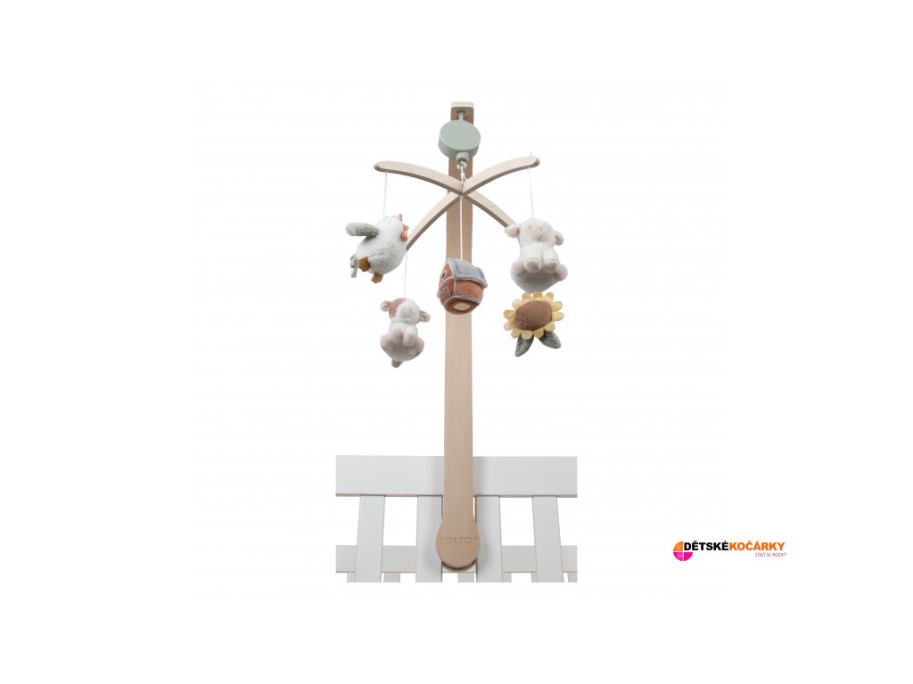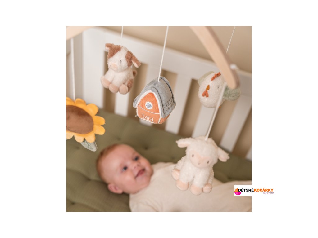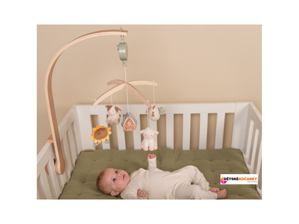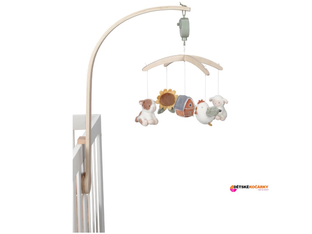 Dřevěný kolotoč LITTLE DUTCH Farma s pěti otáčejícími se zvířátky, který hraje ukolébavku a snadno se připevní na postýlku, je ideální pro uklidnění miminka od narození.