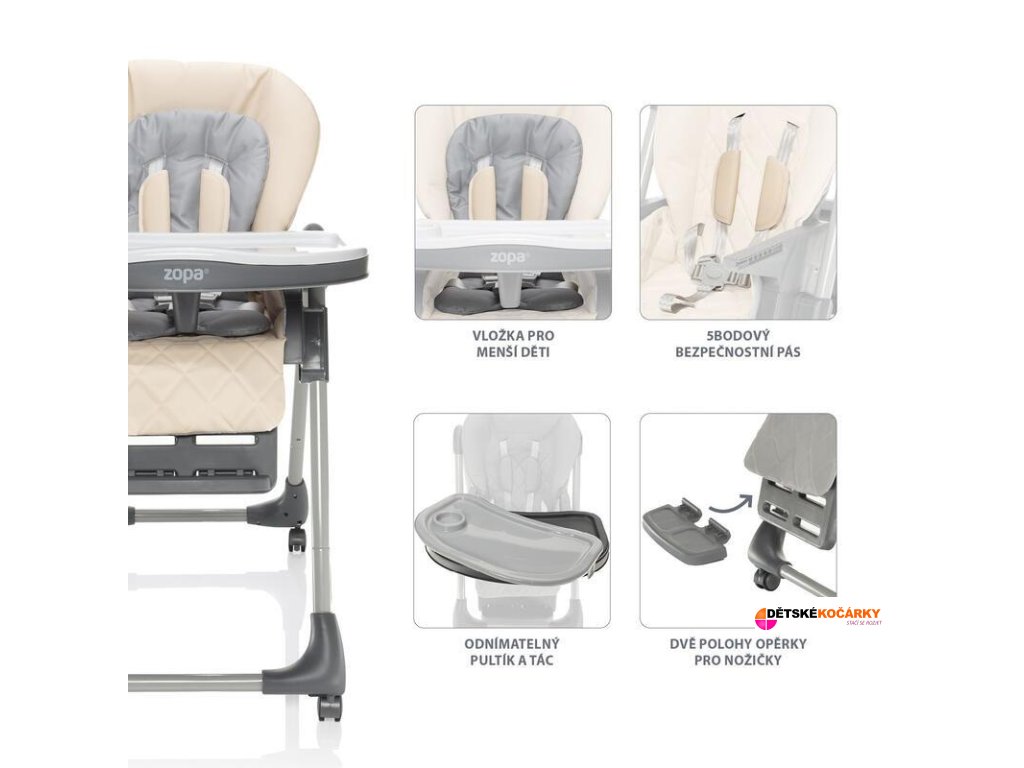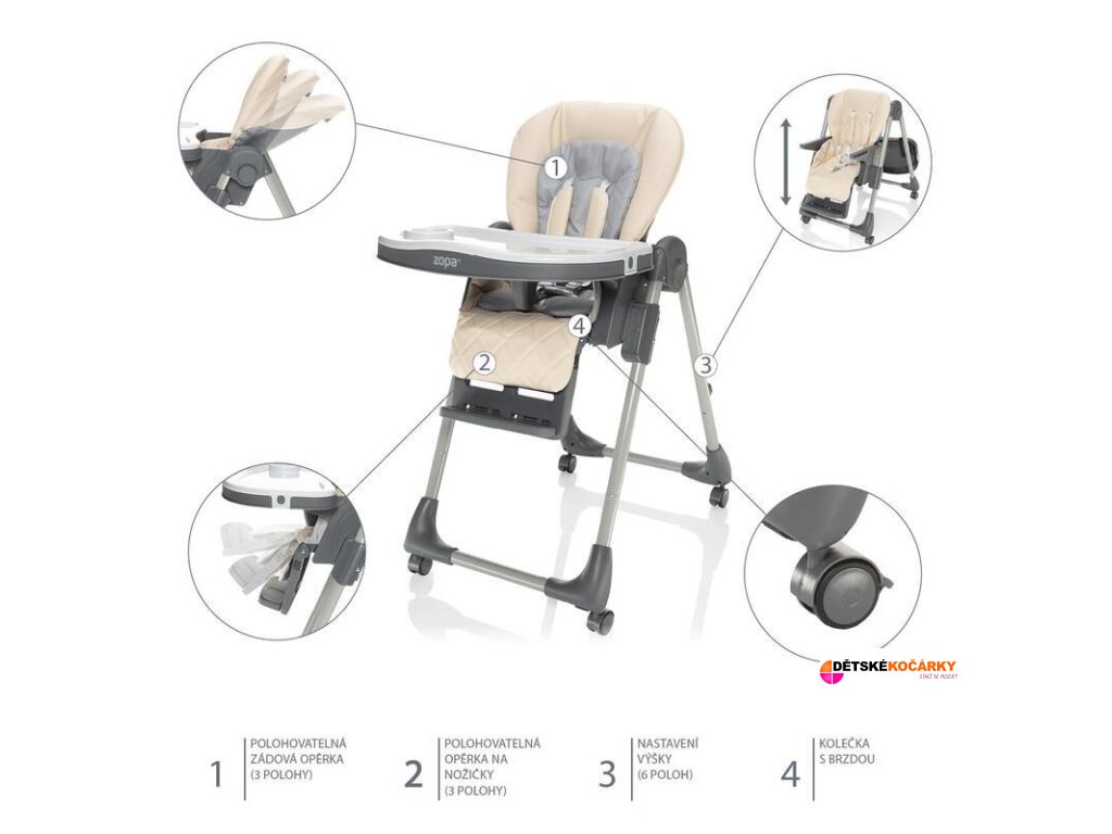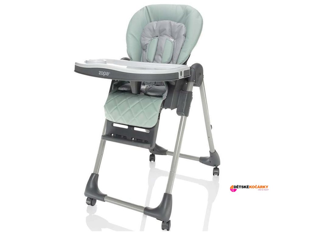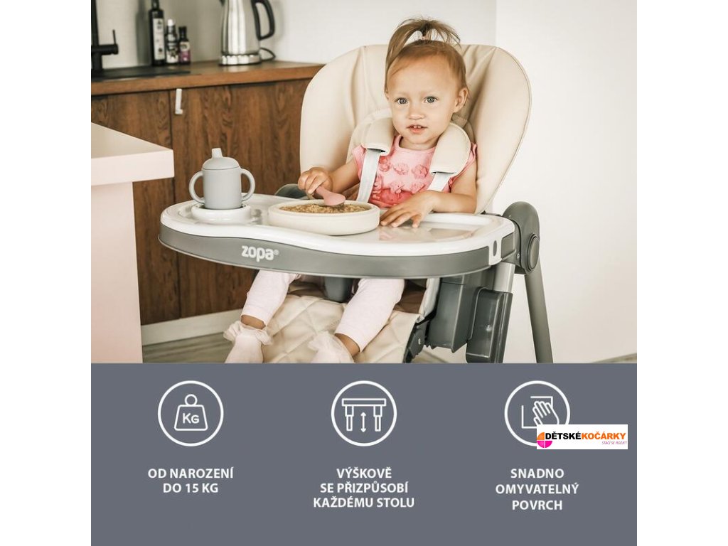 Polohovatelná zádová opěrka, polohovatelná opěrka na nožičky, nastavení výšky židličky, nastavení vzdálenosti pultíku, 5bodový bezpečnostní pás, snadné čištění, vložka pro menší děti, kolečka s brzdou, kompaktní rozměry ve složeném stavu – to je jídelní židlička ZOPA Monti 2, vhodná pro děti od narození do 15 kg. Zádová opěrka se dá nastavit až téměř do lehu, a to z multifunkční Monti 2 dělá lehačku vhodnou už od narození miminka. Navíc splňuje bezpečnostní normy EN 14988 a EN 12790 a to z ní činí naprosto bezpečného společníka pro ničím nerušené stolování.