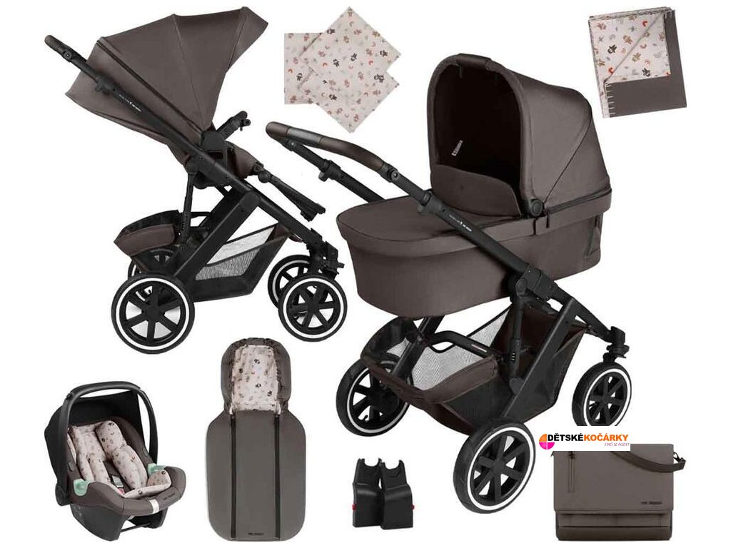 Set obsahuje: podvozek ABC DESIGN Salsa 5 Air + hlubokou korbu + matraci CozyCloud® + sportovní sedečku + vložku do sportovní sedačky + nákupní košík pod kočárek + autosedačku ABC DESIGN Tulip + adaptér pro autosedačku + tašku na pleny ABC DESIGN Urban + novorozenecký fusak + mušelínovou plenu + magnetickou sponu + deku + pláštěnku + moskytiéru