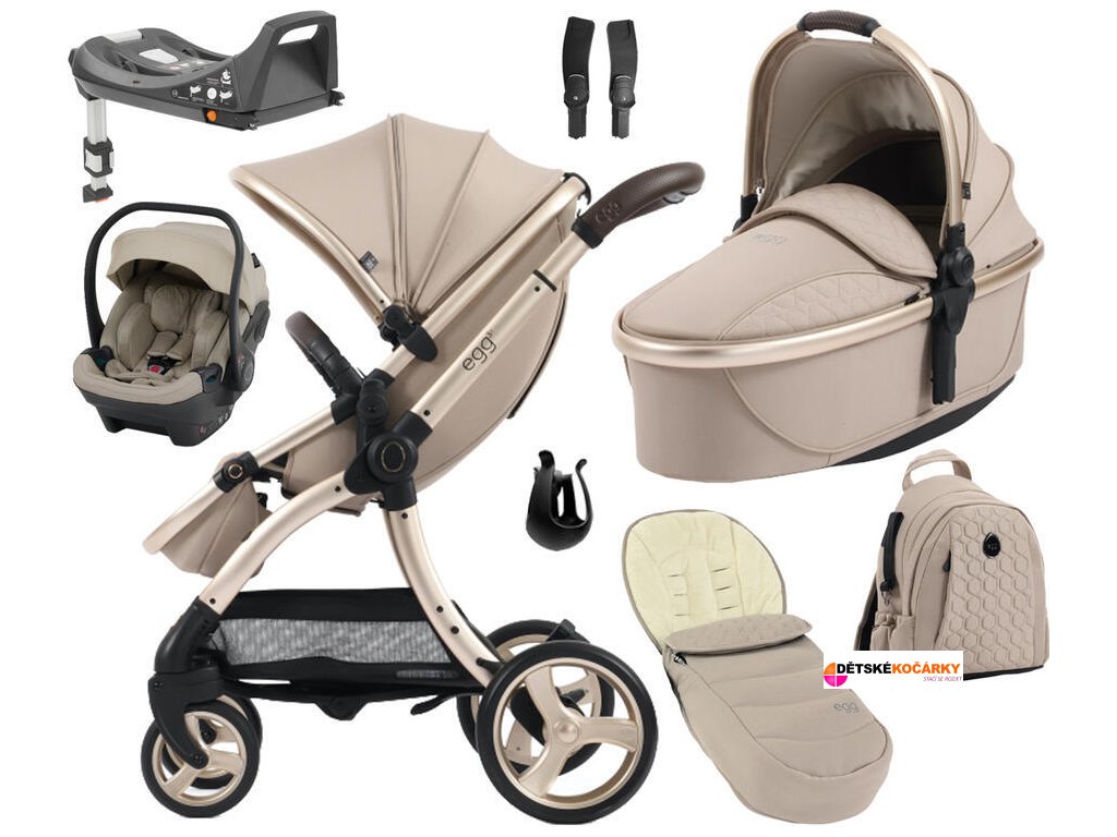 Set obsahuje: podvozek s koly + sedací část s boudou včetně pláštěnky, nánožníku a moskytiéry + hlubokou korbu BABYSTYLE egg3 včetně pláštěnky, nánožníku a matrace + textilní košík + autosedačku Egg Shell i-Size + Egg multi adaptér pro autosedačku + Egg SHELL báze na autosedačku + Egg držák nápojů + Egg3 fusak + Egg3 přebalovací batoh