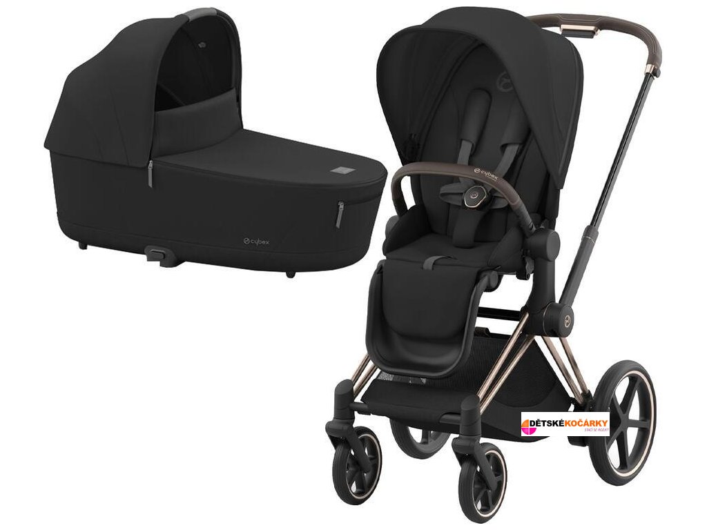 Set obsahuje: podvozek e-Priam Rosegold + Priam Seat Pack + hlubokou korbu CYBEX Priam Lux Carry Cot
