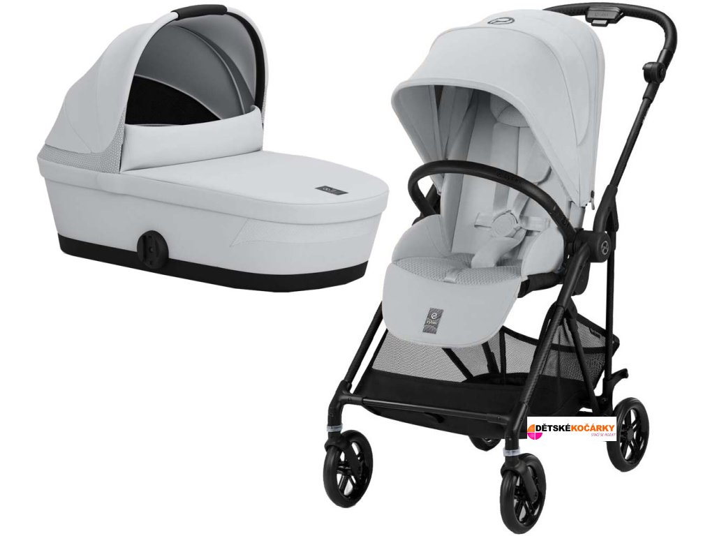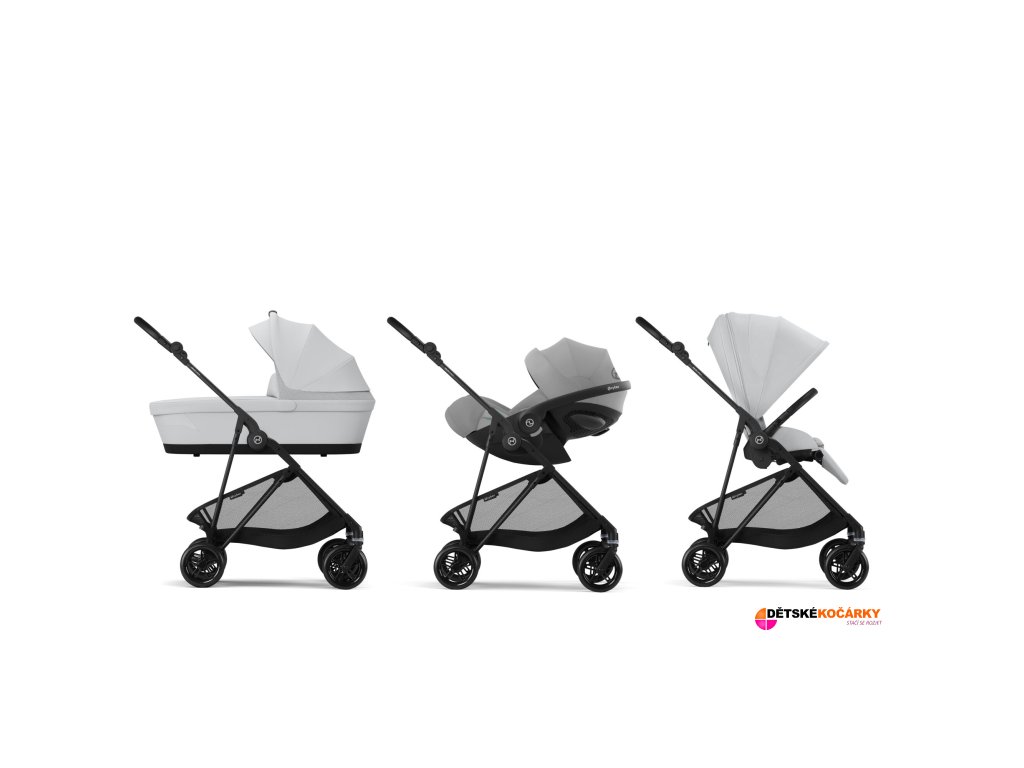 Set obsahuje: podvozek CYBEX Melio Carbon + otočnou sporotvní sedačku + odnímatelné madlo + Newborn Nest v příslušné barevné variantě + nákupní košík + hlubokou korbu CYBEX Melio Cot