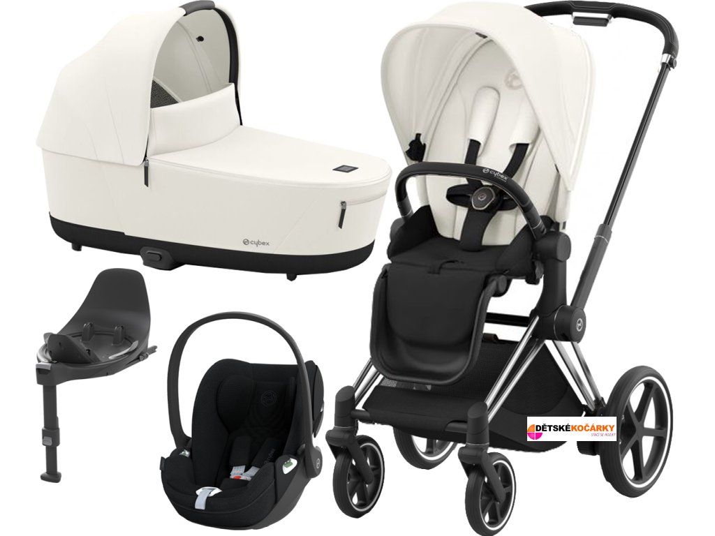 Set obsahuje: podvozek e-Priam Chrome Black + Priam Seat Pack + hlubokou korbu CYBEX Priam Lux Carry Cot + autosedačku CYBEX Cloud T i-Size PLUS + základnu CYBEX Base T