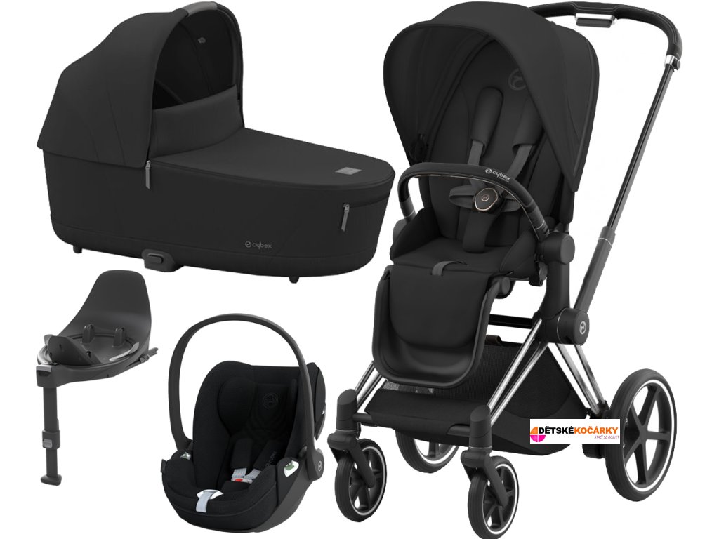 Set obsahuje: podvozek e-Priam Chrome Black + Priam Seat Pack + hlubokou korbu CYBEX Priam Lux Carry Cot + autosedačku CYBEX Cloud T i-Size PLUS + základnu CYBEX Base T