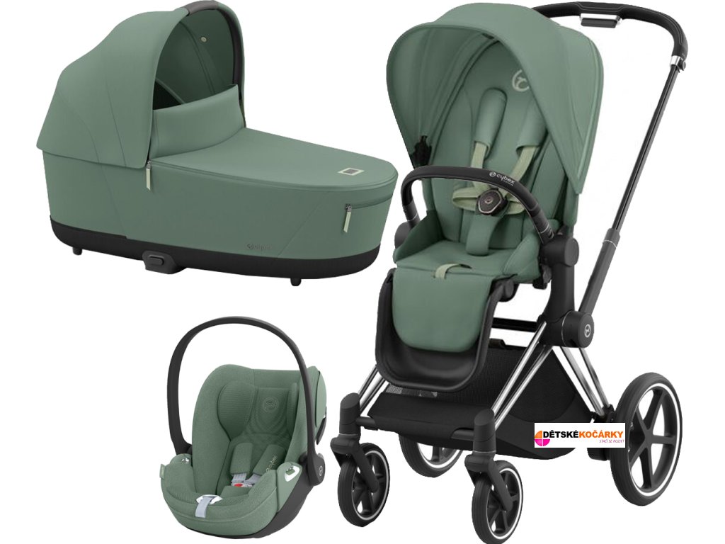 Set obsahuje: podvozek e-Priam Chrome Black + Priam Seat Pack + hlubokou korbu CYBEX Priam Lux Carry Cot + autosedačku CYBEX Cloud T i-Size PLUS