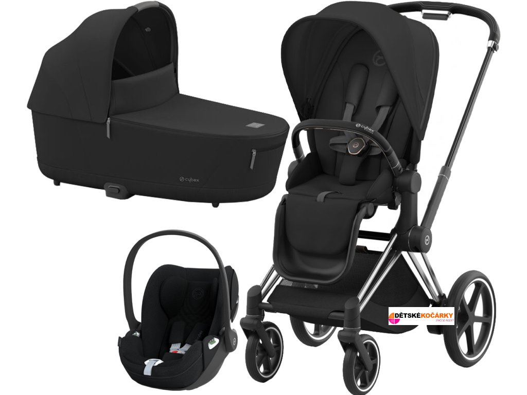 Set obsahuje: podvozek e-Priam Chrome Black + Priam Seat Pack + hlubokou korbu CYBEX Priam Lux Carry Cot + autosedačku CYBEX Cloud T i-Size PLUS