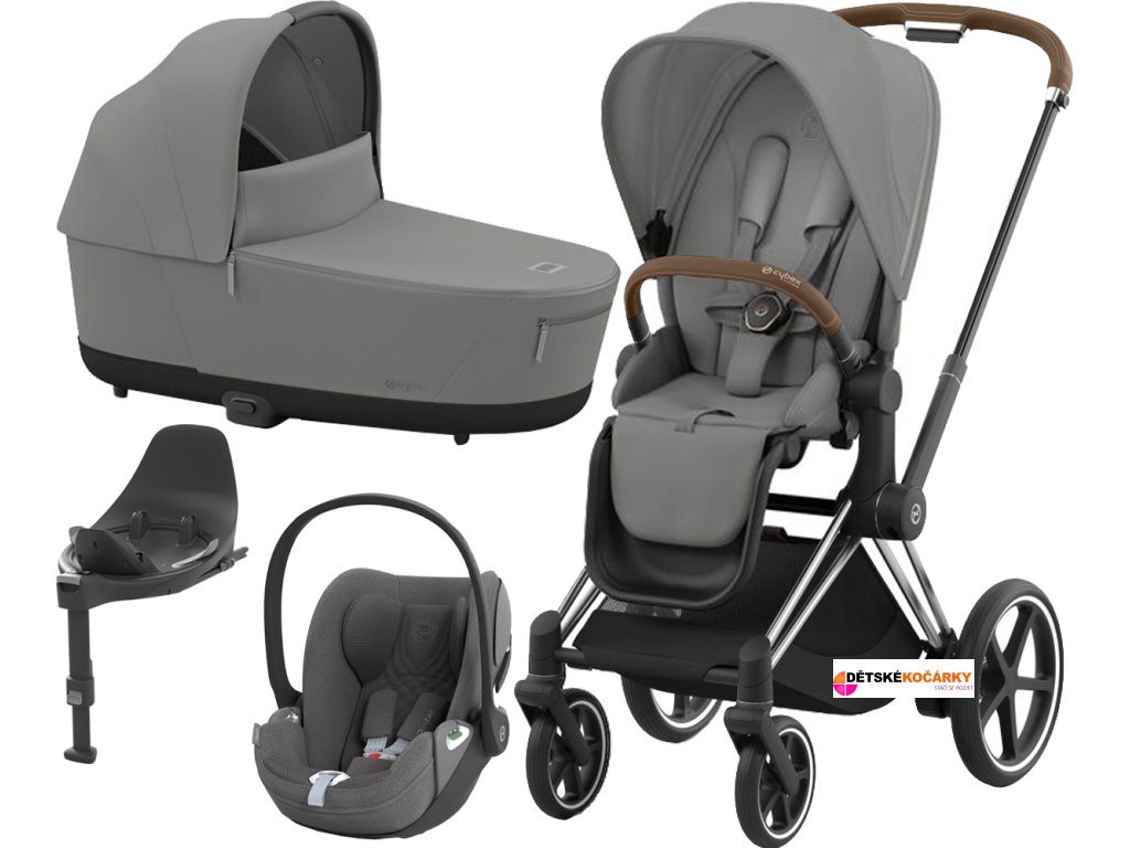 Set obsahuje: podvozek e-Priam Chrome Brown + Priam Seat Pack + hlubokou korbu CYBEX Priam Lux Carry Cot + autosedačku CYBEX Cloud T i-Size PLUS + základnu CYBEX Base T