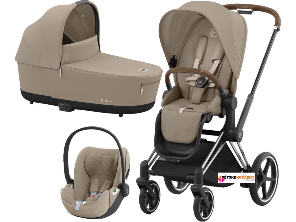 Set obsahuje: podvozek e-Priam Chrome Brown + Priam Seat Pack + hlubokou korbu CYBEX Priam Lux Carry Cot + autosedačku CYBEX Cloud T i-Size PLUS