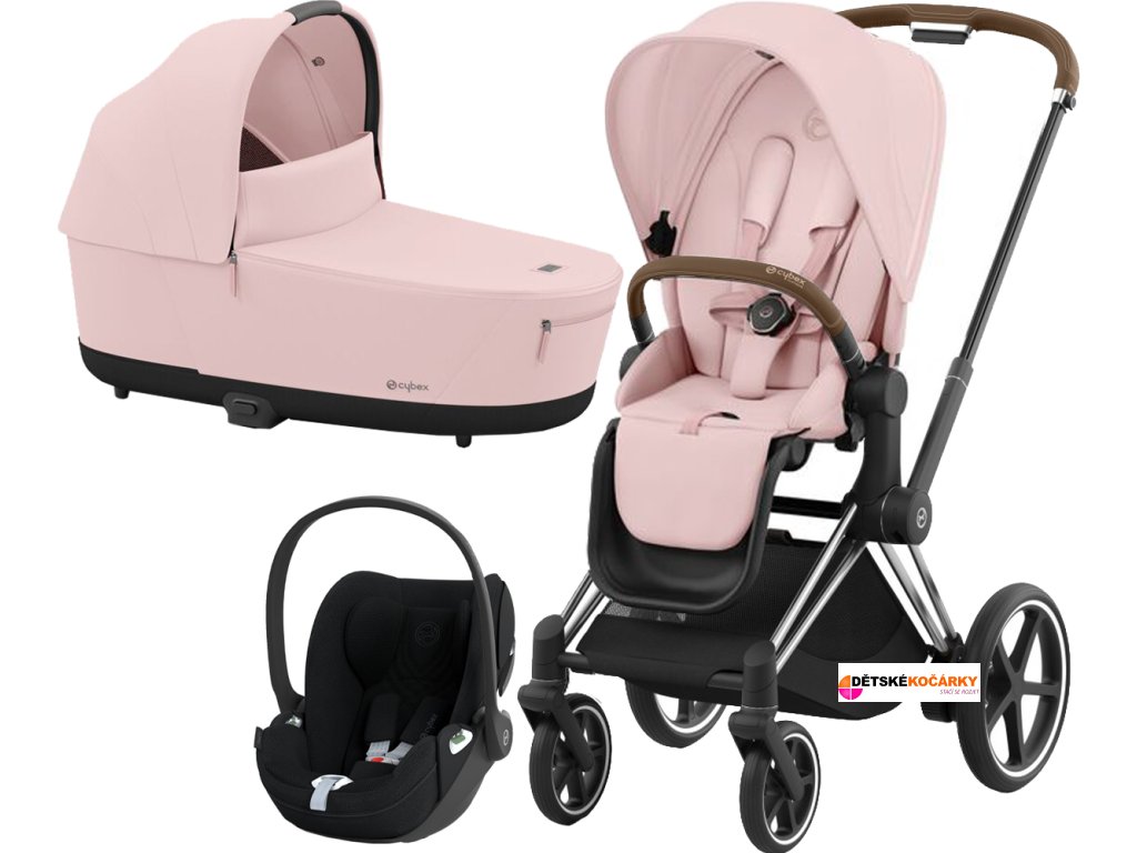 Set obsahuje: podvozek e-Priam Chrome Brown + Priam Seat Pack + hlubokou korbu CYBEX Priam Lux Carry Cot + autosedačku CYBEX Cloud T i-Size PLUS