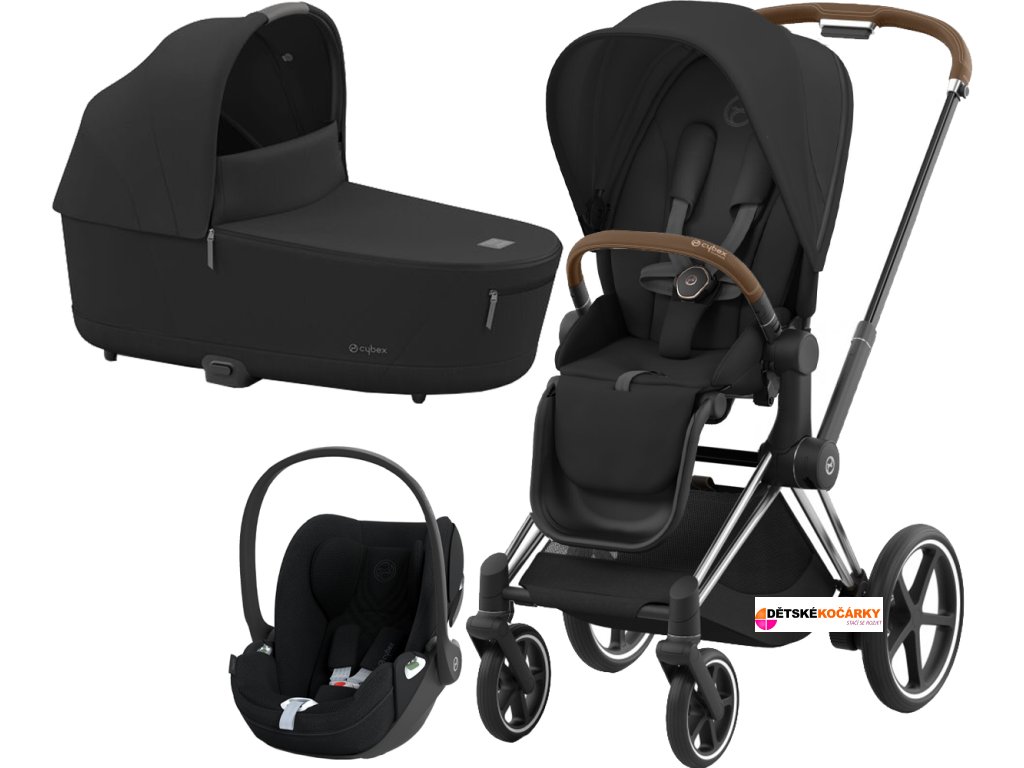 Set obsahuje: podvozek e-Priam Chrome Brown + Priam Seat Pack + hlubokou korbu CYBEX Priam Lux Carry Cot + autosedačku CYBEX Cloud T i-Size PLUS