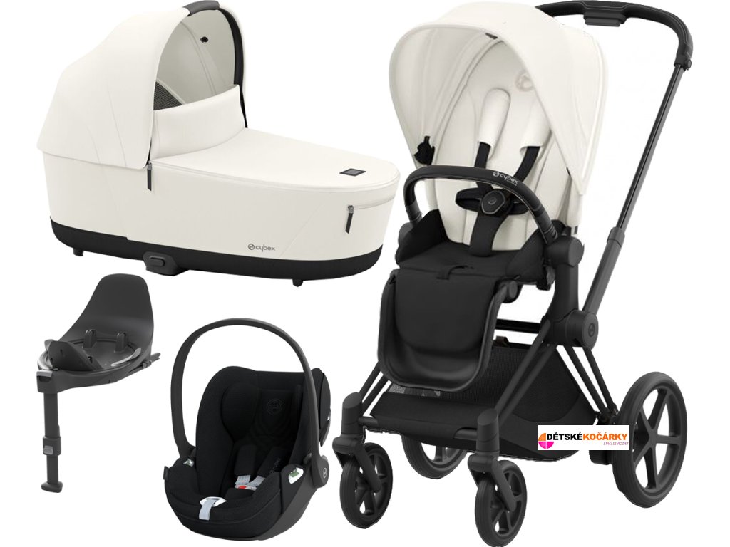 Set obsahuje: podvozek e-Priam Matt Black + Priam Seat Pack + hlubokou korbu CYBEX Priam Lux Carry Cot + autosedačku CYBEX Cloud T i-Size PLUS + základnu CYBEX Base T