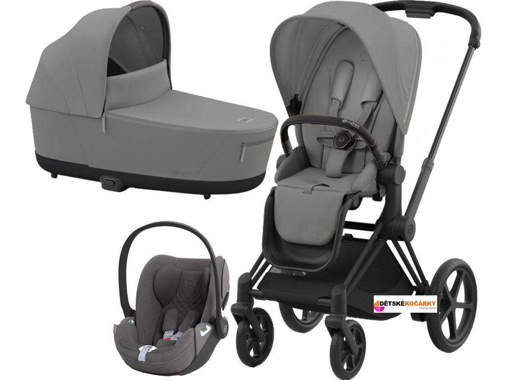 Set obsahuje: podvozek e-Priam Matt Black + Priam Seat Pack + hlubokou korbu CYBEX Priam Lux Carry Cot + autosedačku CYBEX Cloud T i-Size PLUS