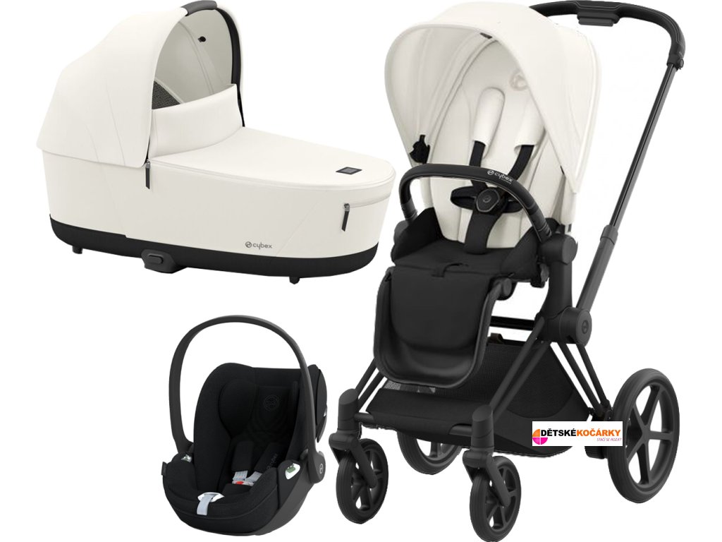 Set obsahuje: podvozek e-Priam Matt Black + Priam Seat Pack + hlubokou korbu CYBEX Priam Lux Carry Cot + autosedačku CYBEX Cloud T i-Size PLUS