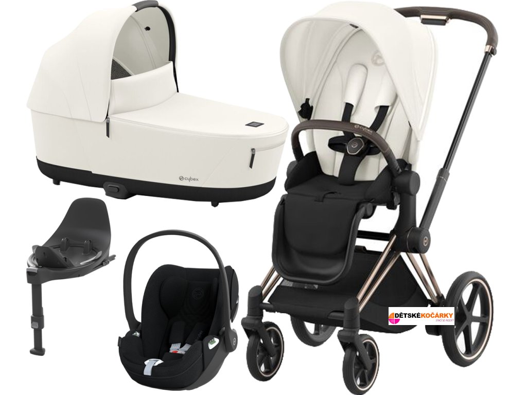 Set obsahuje: podvozek e-Priam Rosegold + Priam Seat Pack + hlubokou korbu CYBEX Priam Lux Carry Cot + autosedačku CYBEX Cloud T i-Size PLUS + základnu CYBEX Base T
