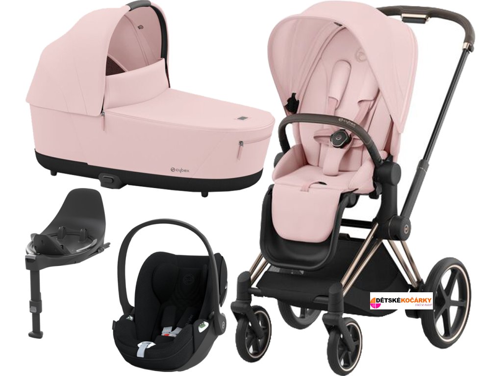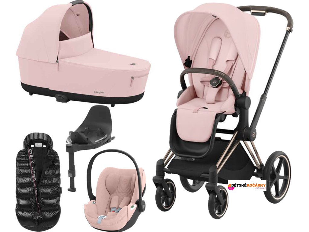 Set obsahuje: podvozek e-Priam Rosegold + Priam Seat Pack + hlubokou korbu CYBEX Priam Lux Carry Cot + autosedačku CYBEX Cloud T i-Size PLUS + základnu CYBEX Base T