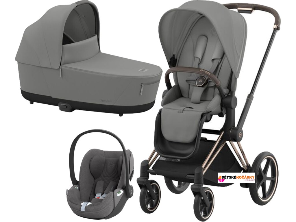 Set obsahuje: podvozek e-Priam Rosegold + Priam Seat Pack + hlubokou korbu CYBEX Priam Lux Carry Cot + autosedačku CYBEX Cloud T i-Size PLUS