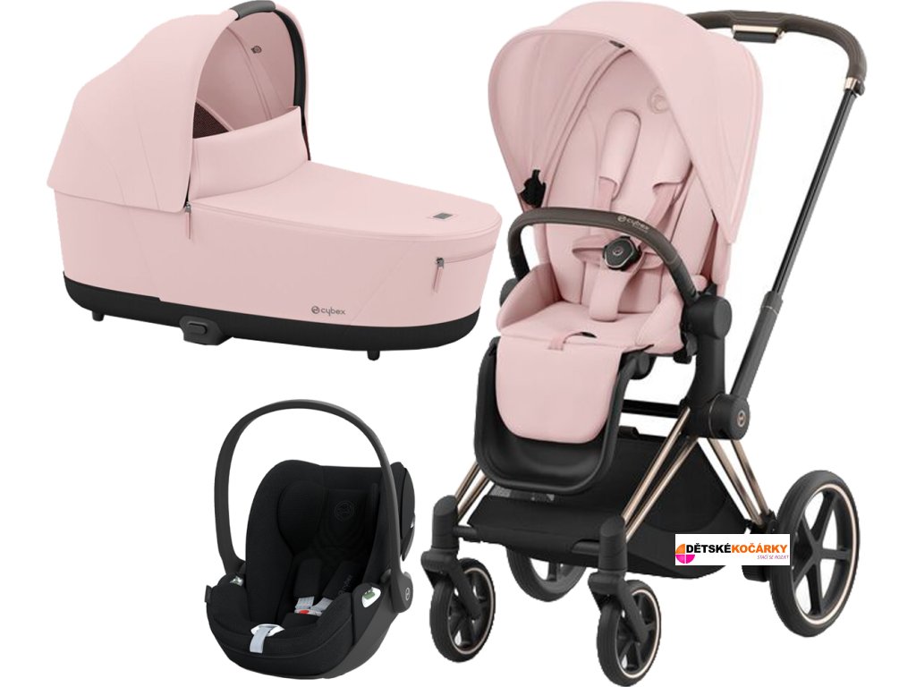 Set obsahuje: podvozek e-Priam Rosegold + Priam Seat Pack + hlubokou korbu CYBEX Priam Lux Carry Cot + autosedačku CYBEX Cloud T i-Size PLUS