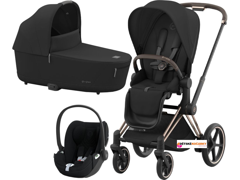 Set obsahuje: podvozek e-Priam Rosegold + Priam Seat Pack + hlubokou korbu CYBEX Priam Lux Carry Cot + autosedačku CYBEX Cloud T i-Size PLUS