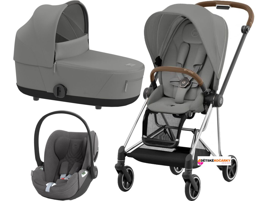 Set obsahuje: podvozek Mios Chrome Brown (vč. nákupního košíku) + rám sportovní nástavby Mios Seat + adaptéry pro autosedačky + pláštěnku + Mios Seat Pack + hlubokou korbu CYBEX Mios Lux Carry Cot + autosedačku CYBEX Cloud T i-Size PLUS