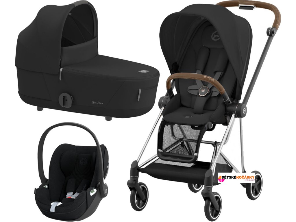 Set obsahuje: podvozek Mios Chrome Brown (vč. nákupního košíku) + rám sportovní nástavby Mios Seat + adaptéry pro autosedačky + pláštěnku + Mios Seat Pack + hlubokou korbu CYBEX Mios Lux Carry Cot + autosedačku CYBEX Cloud T i-Size PLUS
